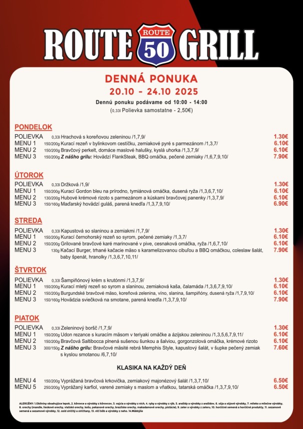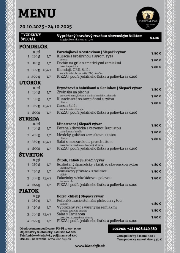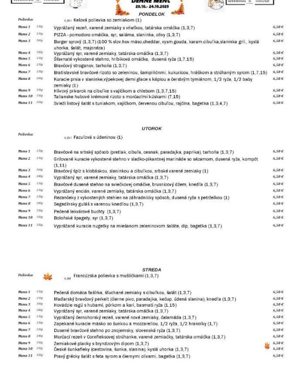 20. 10. 2025 P1 0,33l Frankfurtská s párkom, chlieb 1 P2 0,33l Slepačí vývar s rezancami 1,3,9 1. 150g Kuracie prsia plnené údeným syrom a sušenou paradajkou v slaninovom kabáte, 200g ryža 7,50€ 1,7 2. 150g Bravčové rezančeky v medovo-pikantnej omáčke so zeleninou v zemiakovej placke 7,50€ 1,3,7 3. 350g CAESAR šalát s kuracím mäsom (dressing: caesar/cesnakový) 7,50€ 1,4,7 4. 110g Vyprážaný syr, 200g varené zemiaky, tatárska omáčka 7,50€ 1,3,7,12 5. 350g Domáce parené buchty s maslom a s makovou alebo orechovou posýpkou 7,50€ 1,3,7 6. 150g Bravčový/kurací rezeň alebo ČERNOHOR, 200g maslové baby zemiaky 7,50€ 1,3,7