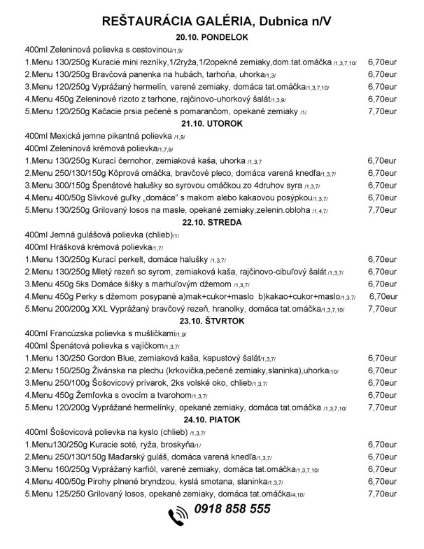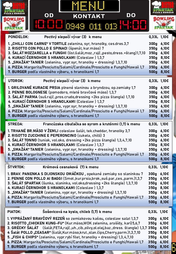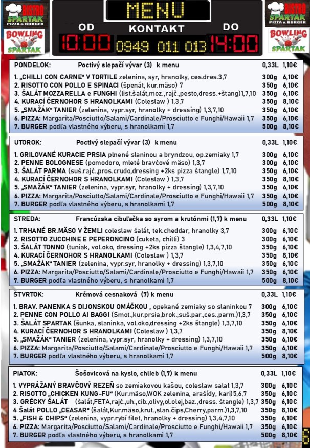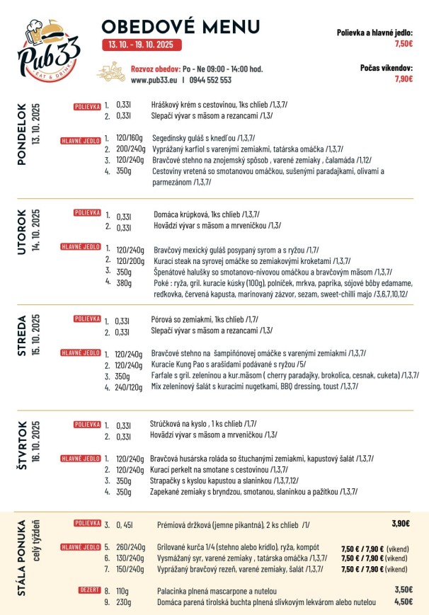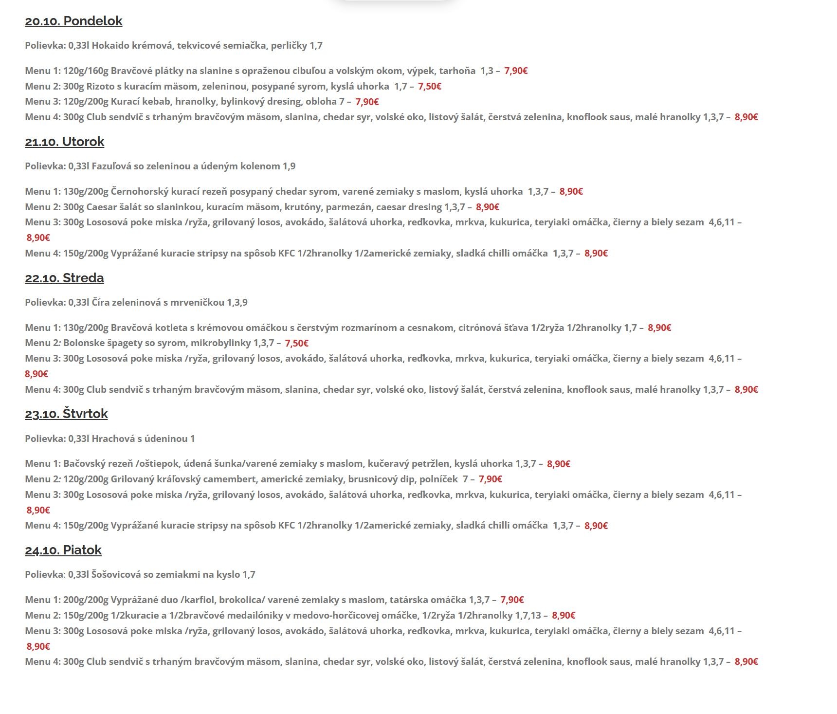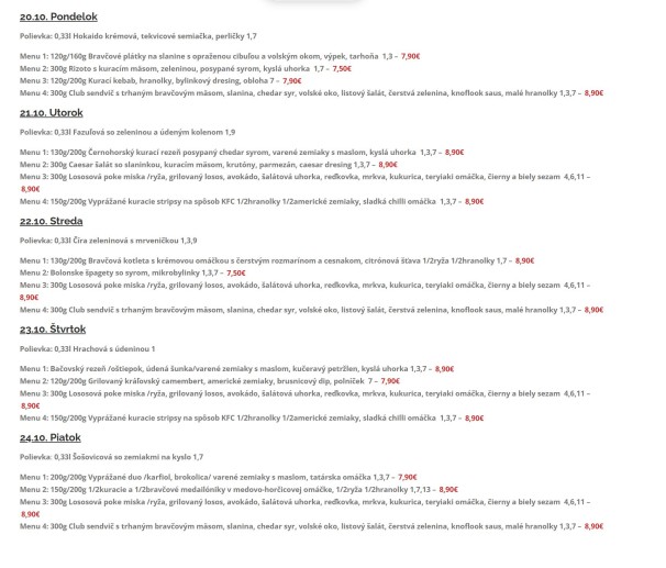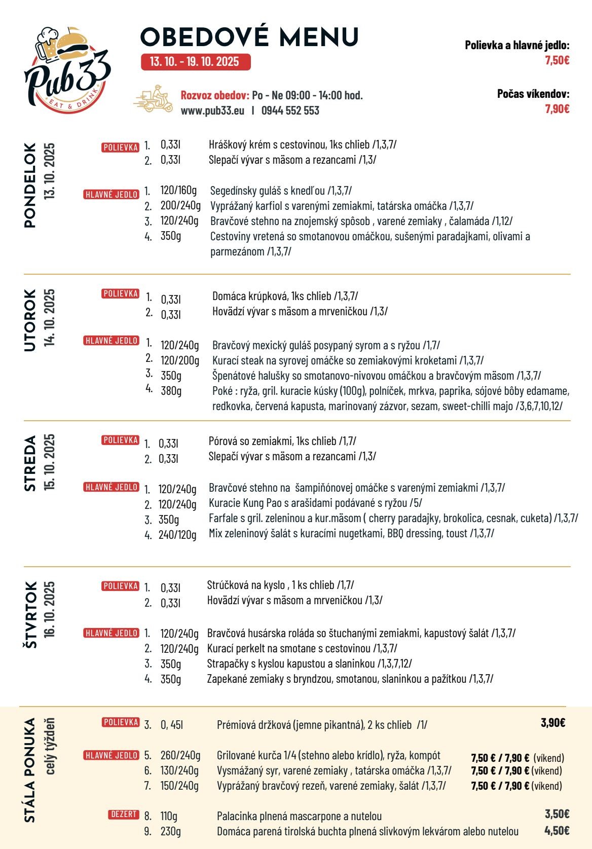 20.10.2025 0,33 l Polievka Slepačí vývar: 1,3,7,9, Hrachová: 1 1. 130g Kuracie prsia na ratatouille zelenine ryža, obloha: 7 6,60 € 2. 150g Grilované bravčové karé slivková omáčka, opekané zemiaky, obloha 6,60 € 3. 130g Černohor kurací posypaný syrom ryža, opekané zemiaky, obloha: 1,3,7 6,60 € 4. 150g Bravčové pečené špikované slaninkou slaninková omáčka, zemiakové pyré 6,60 € 5. 350g Penne all Arrabbiata s opečenou slaninkou a chilli parmezán 1,3,7 6,60 € 6. 330g Zeleninový šalát kuracie kúsky na grile, feta, dressing: 1,7 6,60 € 7. 150g Vyprážaný syr varené zemiaky, tatarská omáčka, obloha: 1,3,7 6,60 €
