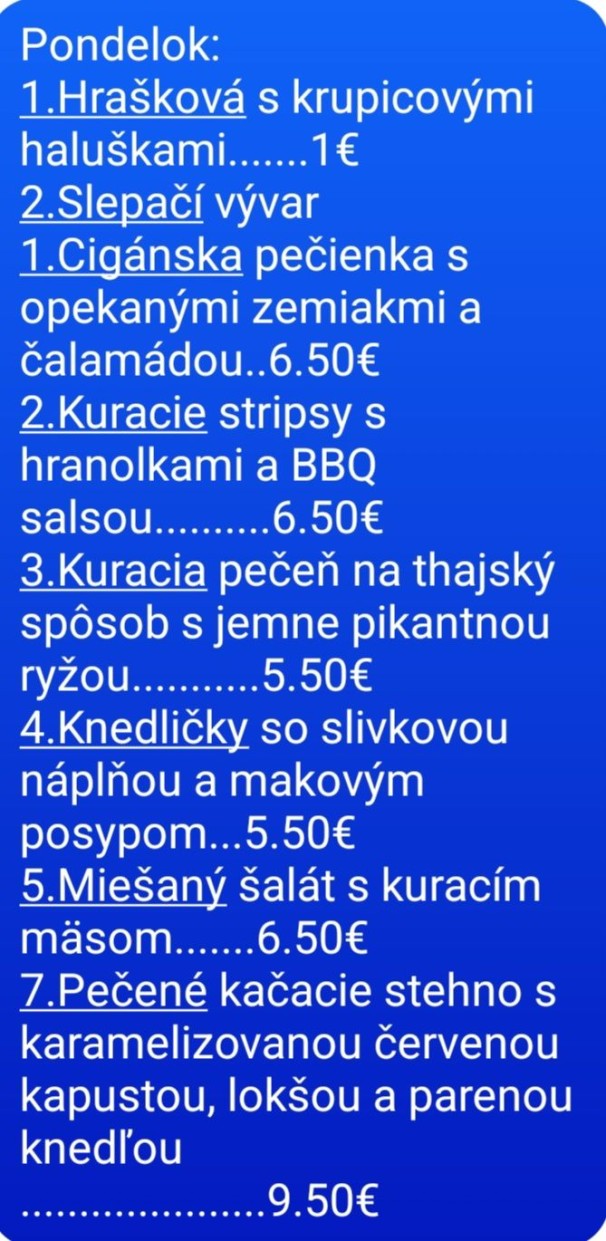 Polievky: Slepačia s mäsom a rezancami Franfurtská s párkom Hlavne jedlo: 1. Bravčové stehno na šampiňónoch, ryža, šalát ..6,50€ 2. Gyros z kuracích pŕs, zeleninová obloha, hranolky, tatárska omáčka..6,50€ 3. Hamburske bravčové mäso, knedľa ..7,00€ 4. Steak z kuracích pŕs, volské oko, 1/2 ryža, hranolky..7,50€