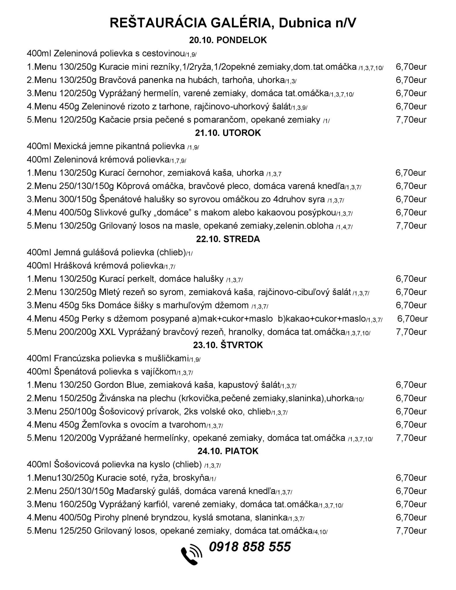 polievka0,33l .(A 1,7,9)Zeleninová krémová, krutóny menu 1120g .(A 1,3,7)Kurací obrátený rezeň, ryža 6,50 € / 7,00 € menu 2120g .(A 1,3,7,9)Zeleninové rezníky, zemiaková kaša, červená repa menu 3300g .(A 1,7,8)Gnocchi s bazalkovým pestom, cherry rajčinami, parmezánom a prosciuttom 7,50 € / 8,00 € menu 4Vyberte si pizzu z našej ponuky, v cene obedového menu 6,50 € / 7,00 € vybrať pizzu