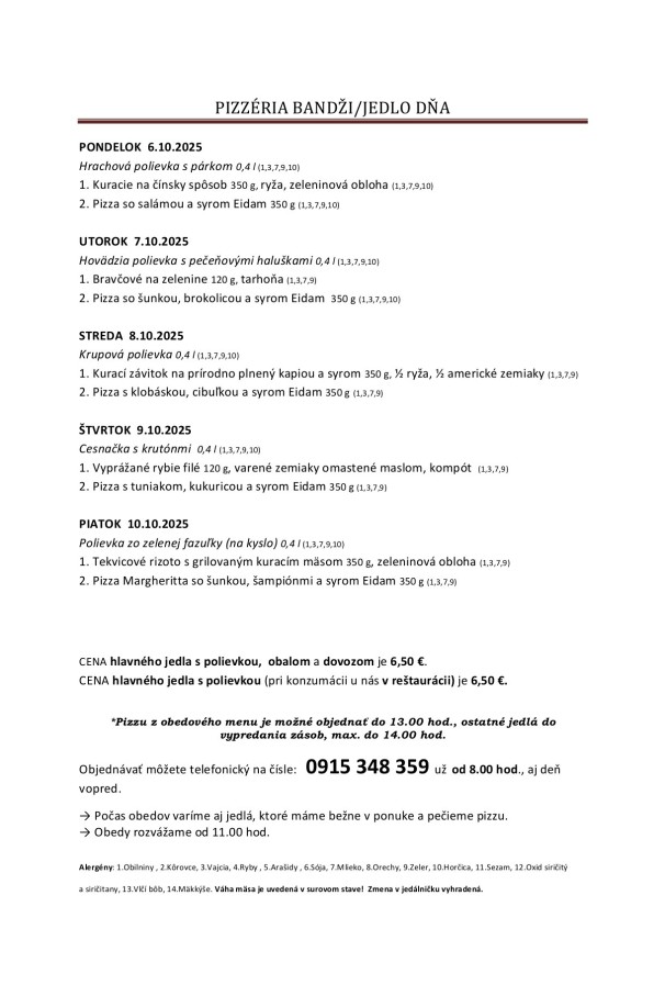 Polievka: Kelová s bielou fazuľou 330l | 2,50 € | v cene menu Krkovička sous vide, slaninová omáčka s cibuľou, pečené zemiaky1 MENU 1 6,50 € Kurací steak na šťave, zemiaková kaša, kompót1,7 MENU 2 6,50 € Divoký losos s parenou zeleninou4,7 MENU 3 7,50 € Segedínsky guľáš, domáca parená knedľa380g, 1,7 MENU 4 6,50 € Kebab tanier400g, 3,7,9,10 MENU KEBAB 7,00 € Šalát s grilovaným hermelínom, jogurtový dresing, brusnice MENU ŠALÁT 6,50 € Dezert: Jablkový koláč s mandľami DEZERT | k menu 2,90 € 3,60 €
