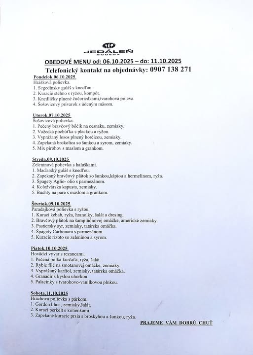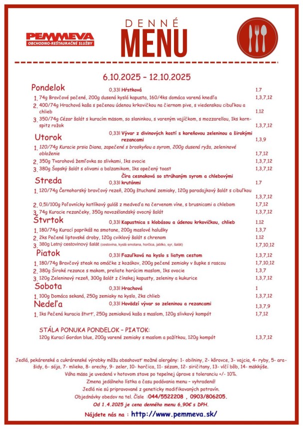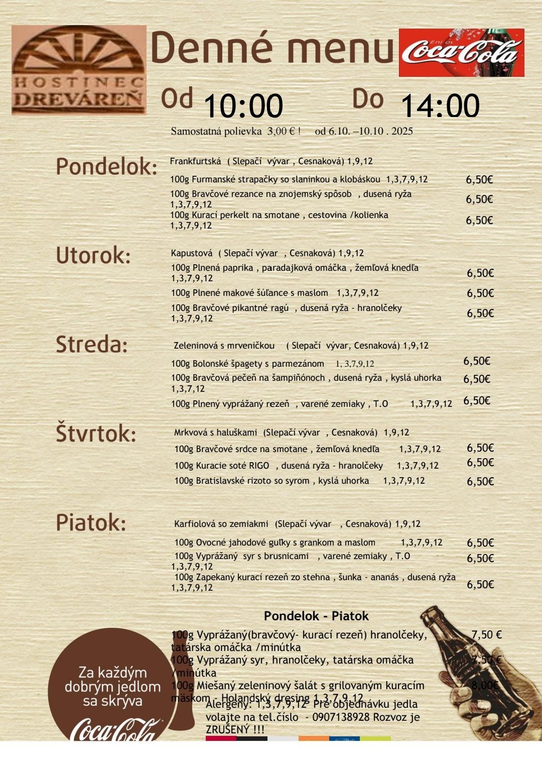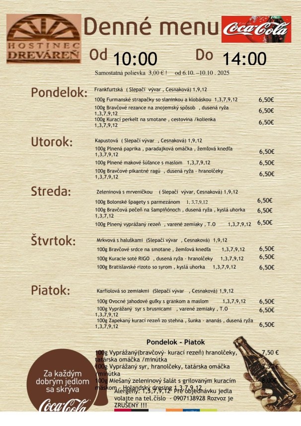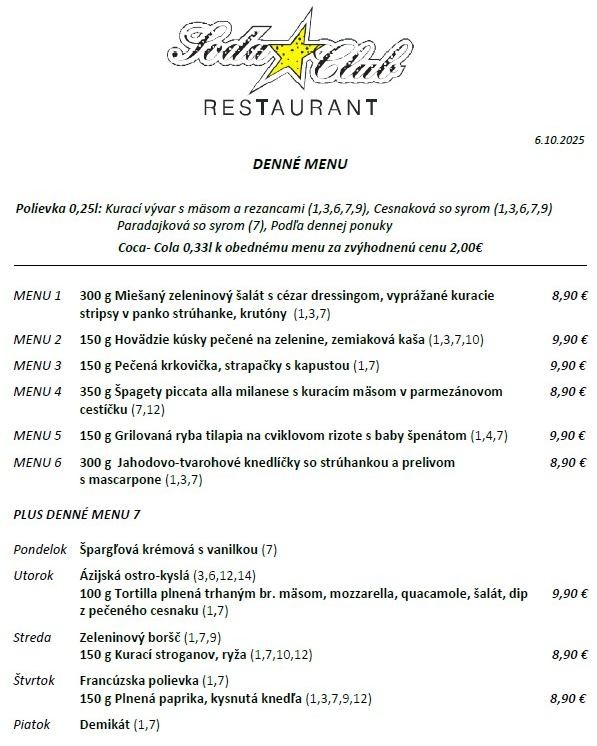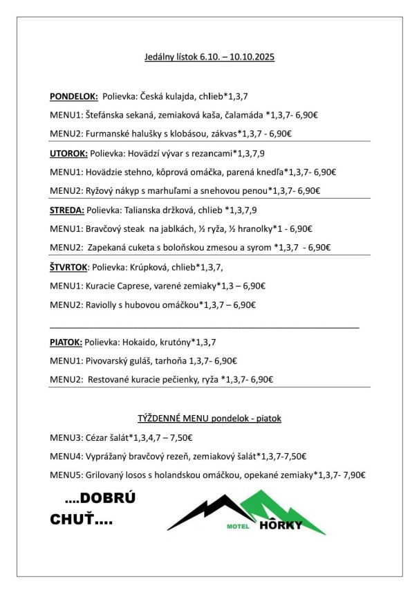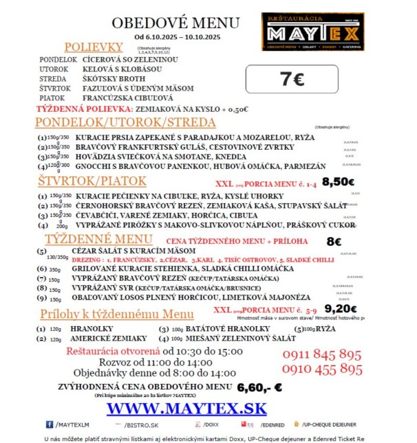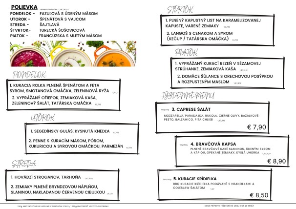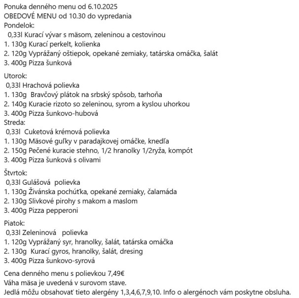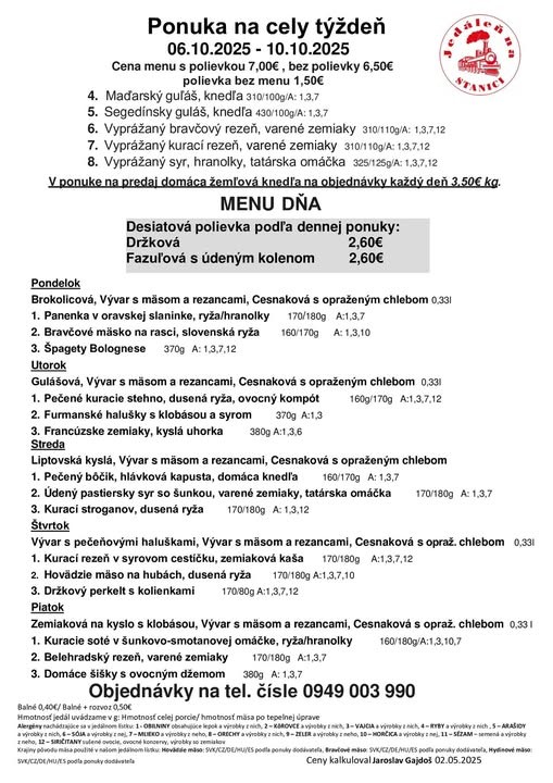 10.10.2025 Polievka: 0,35l Pórová polievka s vajíčkom (1,3) Hlavné jedlo 1: 150/250g Bravčový tokáň na mäsiarsky spôsob, dusená ryža, zeleninový šalát (1) Hlavné jedlo 2: 420g Francúzske zemiaky, kyslá uhorka (3,7) Hlavné jedlo 3: 400g Moravské koláče (1,3,7) Týždenné menu 1: 150g/250g Vyprážaný Cordon-bleu, hranolky, kompót (1,3,7) 7,40 EUR Týždenné menu 2: 150g/250g Zabíjačkový tanier /bôčik, jaternica, klobása/, kyslá kapusta, zemiaky (1,3,7) 7,40 EUR