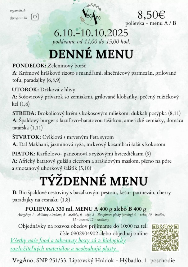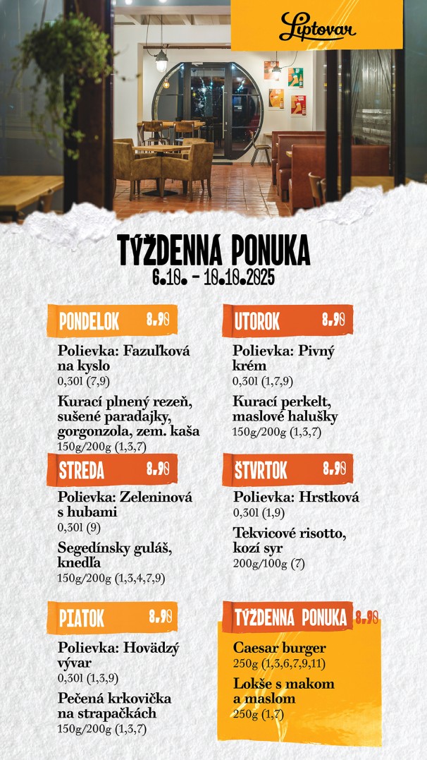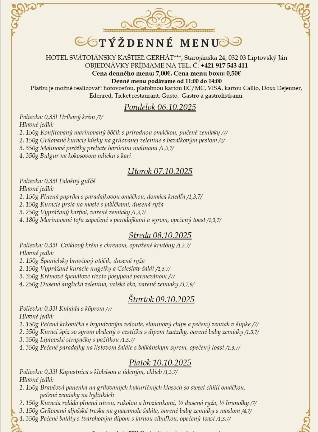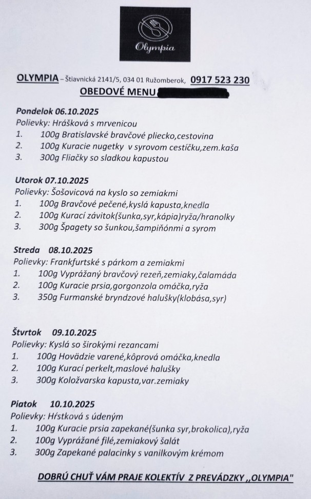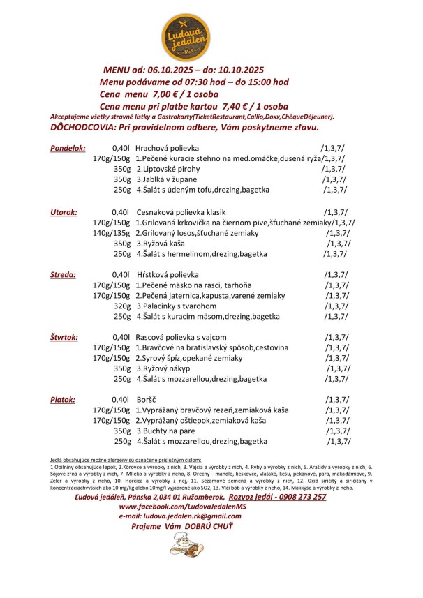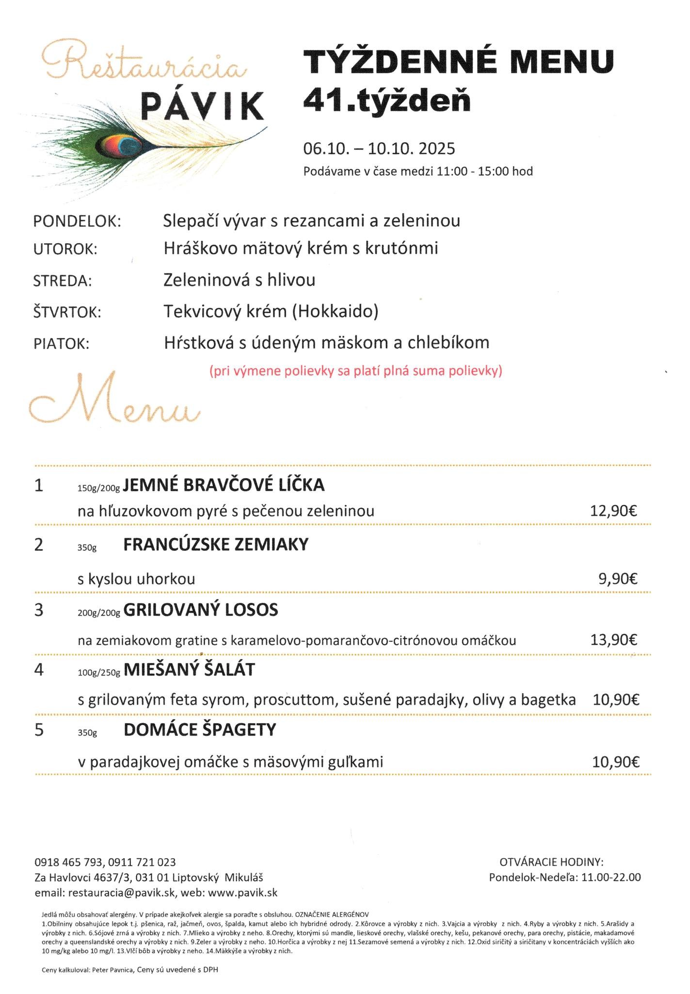 10.10.2025 Polievka: 0,35l Pórová polievka s vajíčkom (1,3) Hlavné jedlo 1: 150/250g Bravčový tokáň na mäsiarsky spôsob, dusená ryža, zeleninový šalát (1) Hlavné jedlo 2: 420g Francúzske zemiaky, kyslá uhorka (3,7) Hlavné jedlo 3: 400g Moravské koláče (1,3,7) Týždenné menu 1: 150g/250g Vyprážaný Cordon-bleu, hranolky, kompót (1,3,7) 7,40 EUR Týždenné menu 2: 150g/250g Zabíjačkový tanier /bôčik, jaternica, klobása/, kyslá kapusta, zemiaky (1,3,7) 7,40 EUR