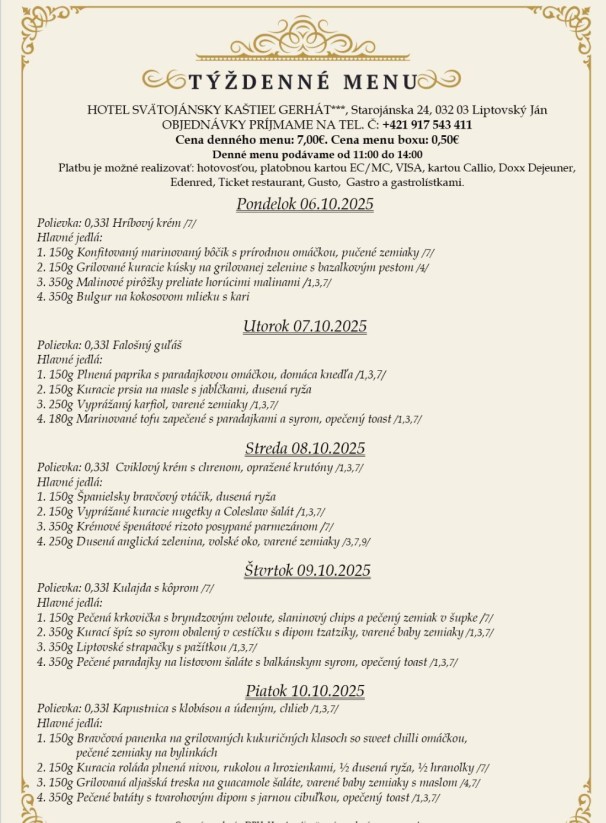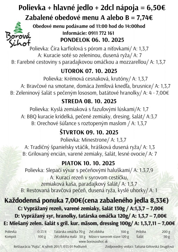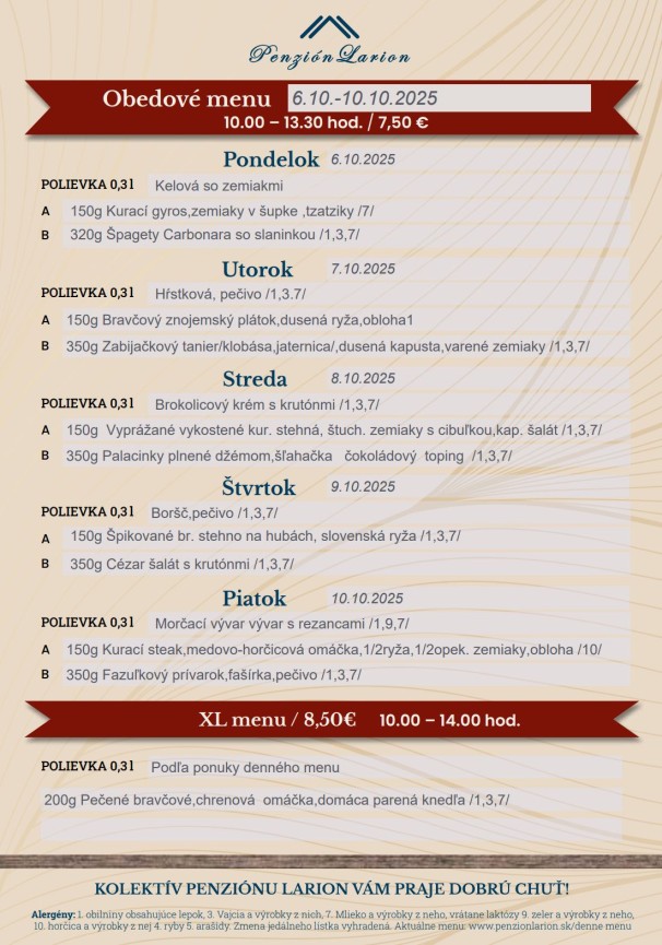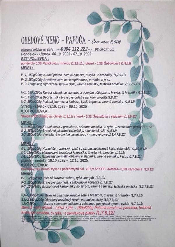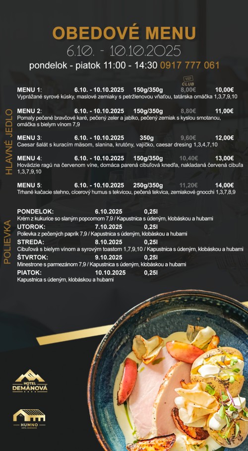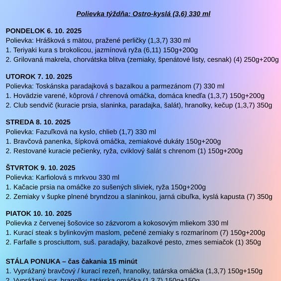 : 0,33l Frankfurtská polievka s párkom 1,3,7,9 10.10.2025 Menu 1: 120g Kurací plátok v syrovej omáčke1,3,7 200g Špenátové halušky TÝŽDENNÁ PONUKA: Menu 2: 0,33l Polievka podľa dennej ponuky 120g Kurací steak na anglickej zelenine, 150g Zemiakové krokety Menu 3: 0,33l Polievka podľa dennej ponuky 110g Vyprážaný encián v pivnom cestíčku, 200g Varené zemiaky 1,3,7