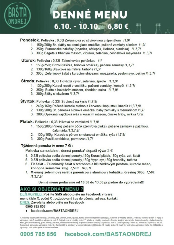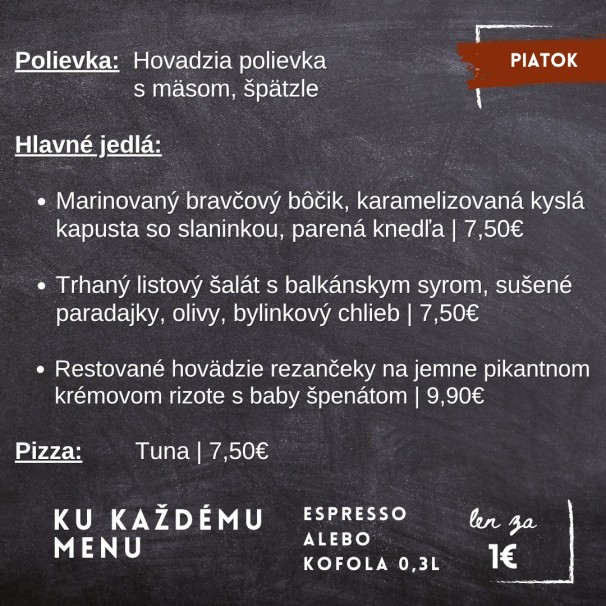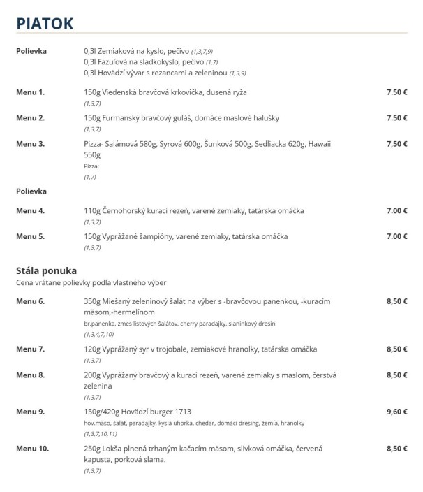 10.10. Pohánková polievka s údeným mäsom A/1,9 1. 200g Holandský sekaný rezeň so syrom a bylinkami, zemiaková kaša, kyslá uhorka A/1,3,7 ...7,50€ (u nás) / 7,70€ (na donášku) 2. 150g Pečená bravčová krkovička, kyslá kapusta s hubami, knedľa A/1 ...7,50€ (u nás) / 7,70€ (na donášku) 3/1. 350g Cviklové rizoto s kuracím mäsom sous-vide, špenátové listy, parmezán A/7 ...7,50€ (u nás) / 7,70€ (na donášku) 3/2. 350g Cviklové rizoto s grilovaným kozím syrom, špenátové listy, parmezán A/7 ...7,50€ (u nás) / 7,70€ (na donášku) 4. 350g Tortilla s trhaným hovädzím mäsom, hranolky, tatárska omáčka (coleslaw z červenej kapusty, slanina, cheddar) A/1,3,7 ...7,50€ (u nás) / 7,70€ (na donášku) 5. 350g Zeleninový šalát s tuniakom, vajíčkom a reďkovkou, dresing z kyslej smotany, bageta A/1,4,7,10 ...7,50€ (u nás) / 7,70€ (na donášku) 6. 600g ŠPECIÁL Z A LA CARTE: Bravčové spare ribs, hranolky, cesnaková majonéza A/1,3,7,10 ...16,90€ (vrátane dennej polievky, možnosť objednať len v reštaurácii, špeciál nie je možné objednať na donášku) 7. 250g ŠPECIÁL Z A LA CARTE: Steak z hovädzej sviečkovice, house demi-glace, hranolky A/9 ...25,90€ (vrátane dennej polievky, možnosť objednať len v reštaurácii, špeciál nie je možné objednať na donášku)