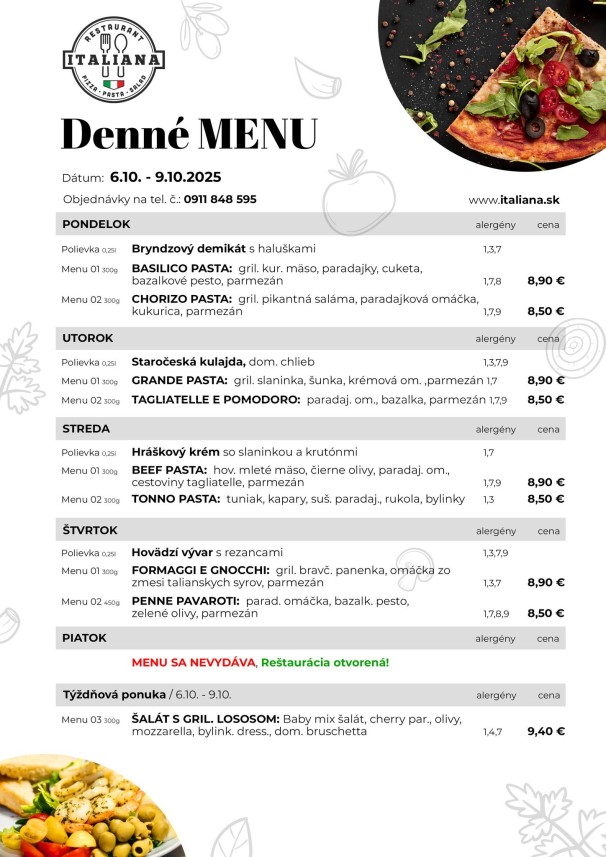 10.10.2025 0,33l Francúzska polievka (1,3,7) 120g/150g Kuracie prsia na grile s teplou zeleninou na masle ,dusená ryža (1,7) 120g/150g Živánska v alobale, kyslé pochutiny 270g Špagety s krémovo cesnakovo syrovou omáčkou s parmezánom (1,3,7) 270g Cestovinový šalát s tuniakom a olivami (1,3,4,7) + MENU: 120g/150g Vyprážaný kurací rezeň, varené zemiaky / hranolky (1,3,7) 120g/150g Vyprážaný bravčový rezeň, varené zemiaky / hranolky (1,3,7) 120g/150g Vyprážaný syr, varené zemiaky / hranolky (1,3,7)