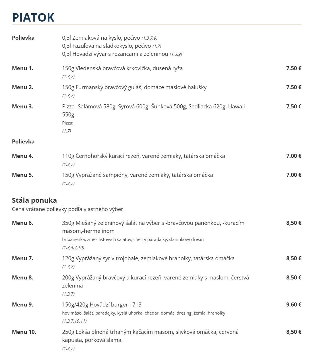 PIATOK 0,25l Slovenská šajlava /1,12/ 1. Bravčová panenka na restovanom špenáte, slaninový chips, Hermelín, pečené .zemiaky /1,3,7,12/ 8.10 € 2. Marinovaný kurací rezeň, dusená ryža, šalát /1,3,6,10,12/ 7.90 € 3. Vyprážaný syr, varené zemiaky, domáca tatárska omáčka /1,3,7,12/ 7.70 € TÝŽDENNÁ PONUKA 0,25l Kurací vývar s mäsom, rezancami a zeleninou /1,3,7,9,12/ 2.30 €