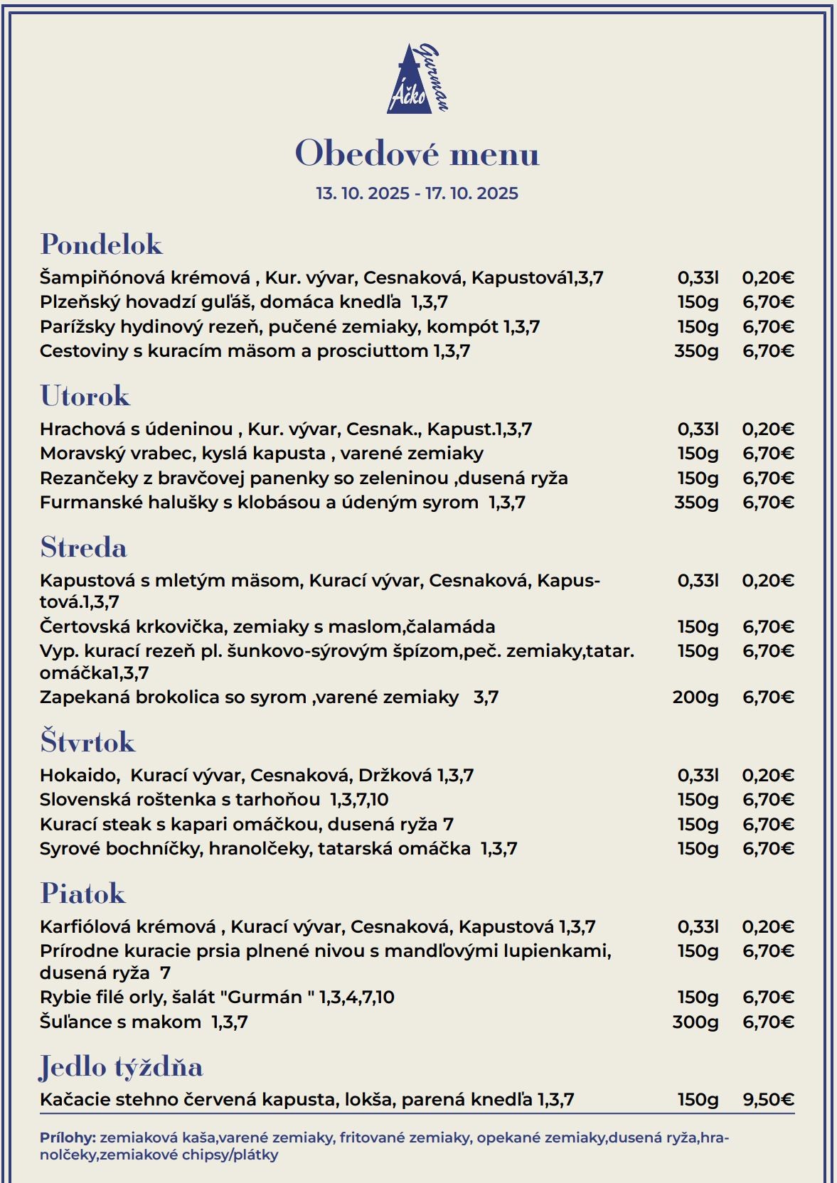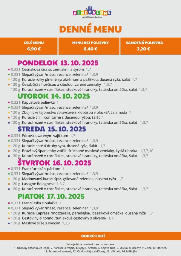 14.10. polievka: 0,45 l Fazuľová s údeným (A:1,7) hl. jedlo I: 140g/200g Záhradnícke kuracie prsia, tarhoňa (A:1,7) II: 140g/220g Plnený kapustný list, zemiaky (A:1,3) III: 460g Bylinkové zemiačky s cuketou, croissant (A:1)