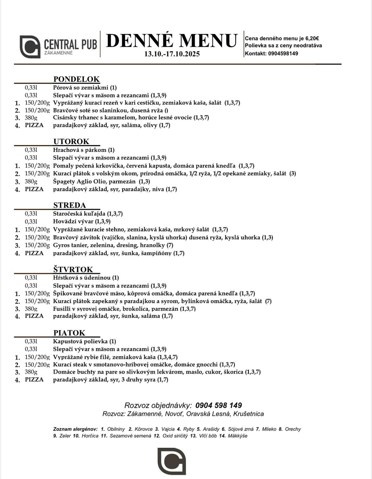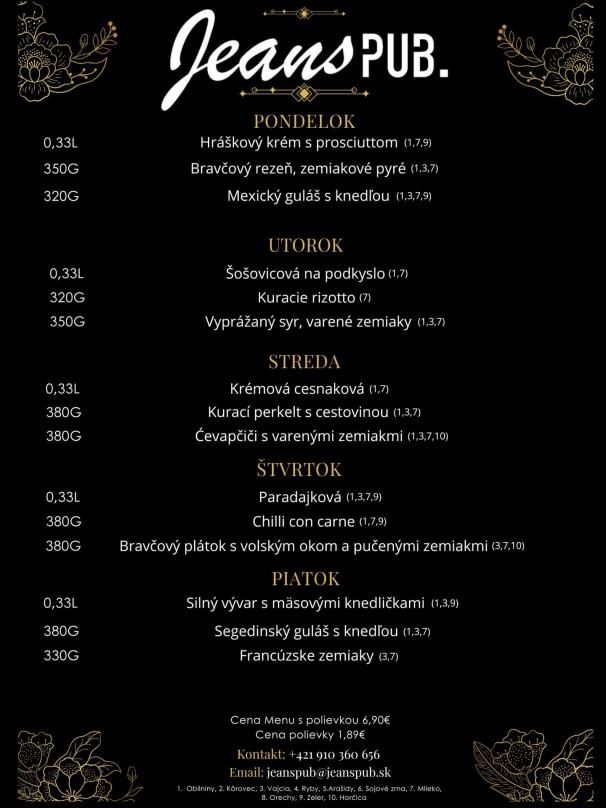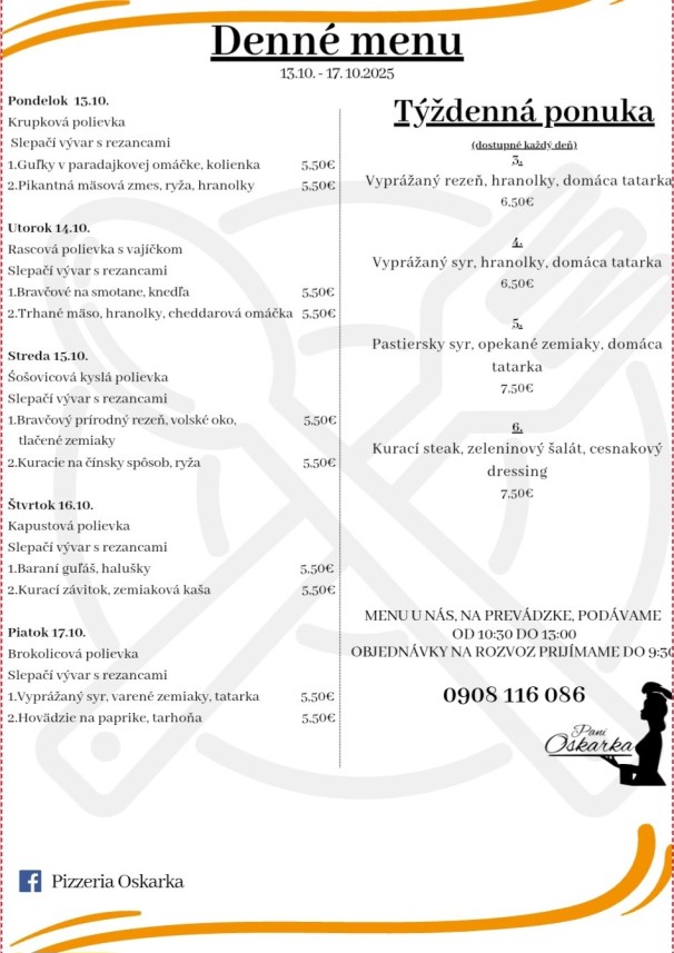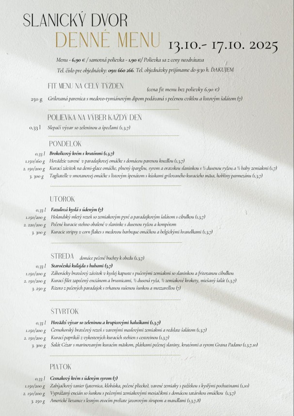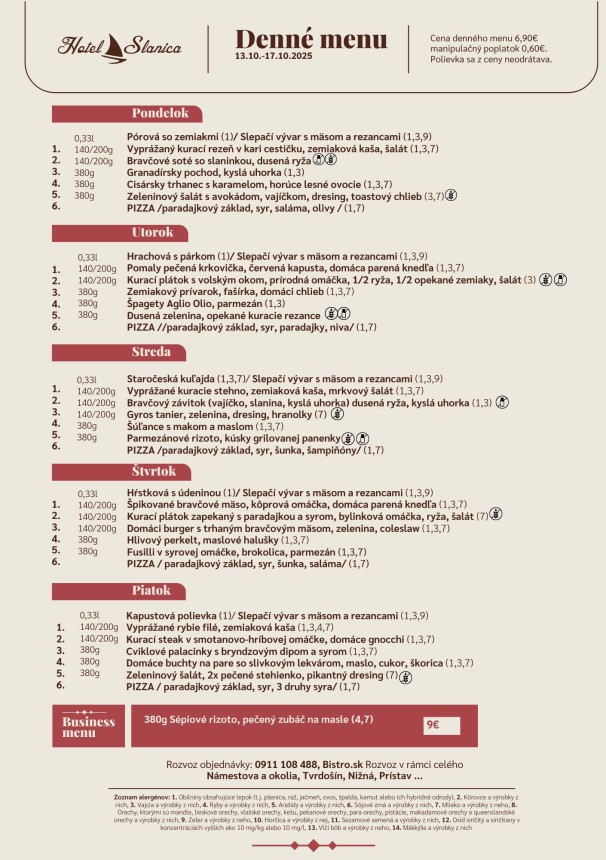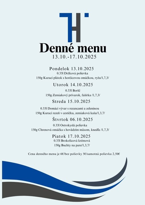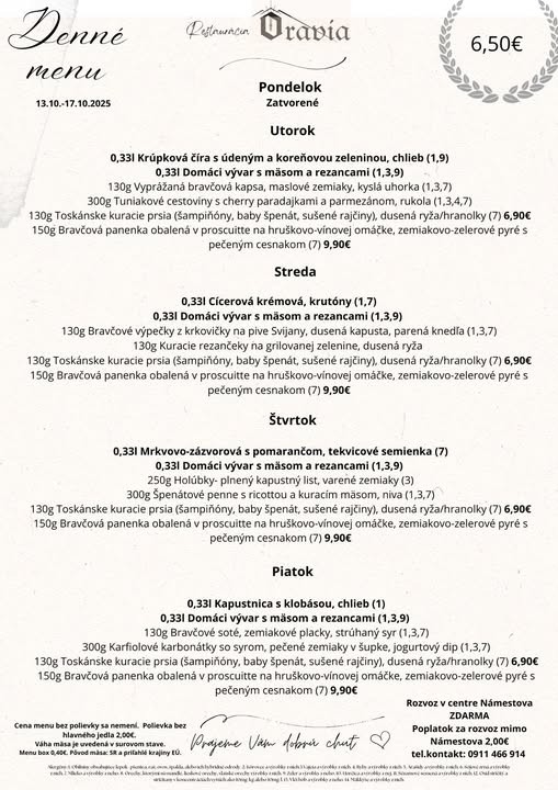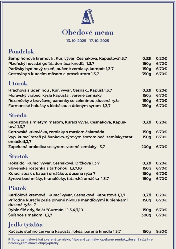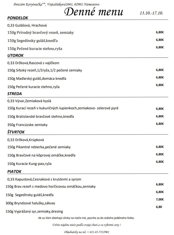 Polievky: Talianska s cestovinou / Vývar s mäsom a cestovinou Hlavné jedlá Jelenie soté v hubovej omáčke, pučené zemiaky 6.50 € Pečené bravčové pliecko, dusená kapusta, knedľa 6.50 € Grécke bravčové scifado, cestovina 6.50 € Vyprážaný bravčový rezeň, zemiaková kaša, kyslá uhorka 6.50 € Zapečený kurací plátok (zelená fazuľka, syr), ryža 6.50 € Listový šalát s avokádom, schwarzwaldská šunka, hrozno, vajíčko, balkánsky syr, hrianka 6.50 €