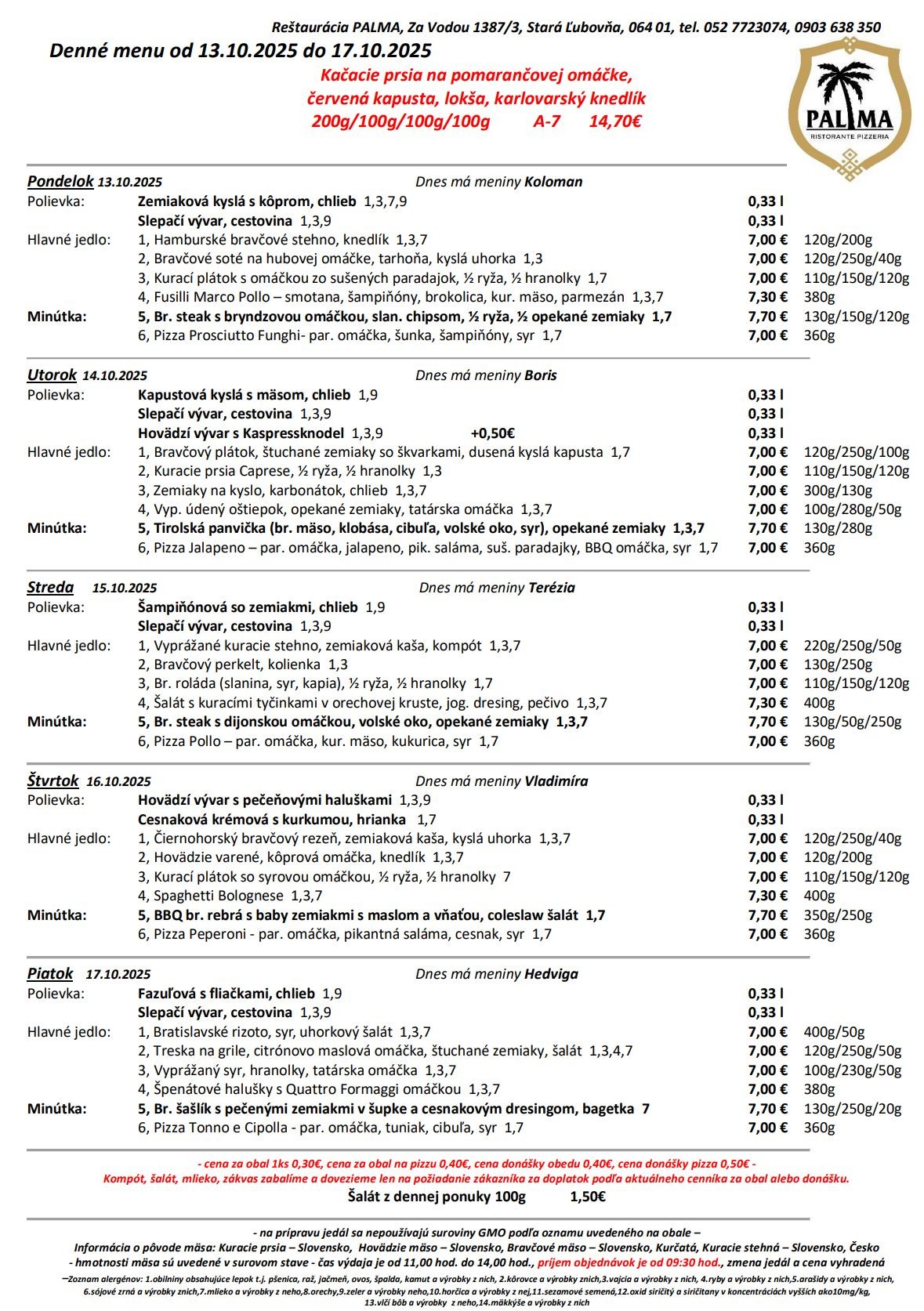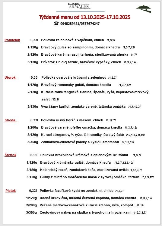 13.10.2025 Polievka 1. Brokolicová s mrkvou a zemiakmi 0,33 l 2,05 € Polievka 2. Slepačí vývar s cestovinou a zeleninou 0,33 l 2,15 € Hl. jedlo 1. Kurací steak s nivovou omáčkou, ½ ryža, ½ hranolky 120 g 6,10 € Hl. jedlo 2. Halušky s tvarohom a slaninou 350 g 6,00 € Hl. jedlo 3. Cestovinový šalát s tuniakom 350 g 7,00 € Hl. jedlo 4. Pizza Hawai 350 g 6,90 € Špec. týždňa Pečené kačacie stehno "Barbar", červená kapusta, lokša 300 g 8,90 €