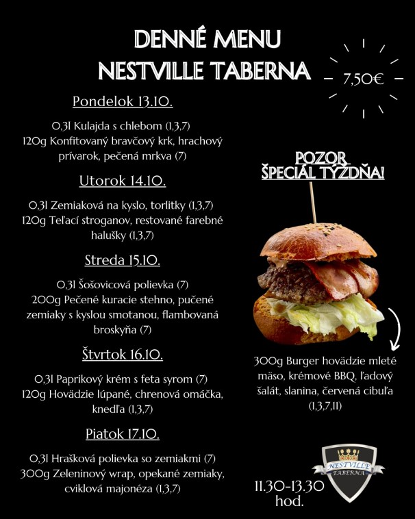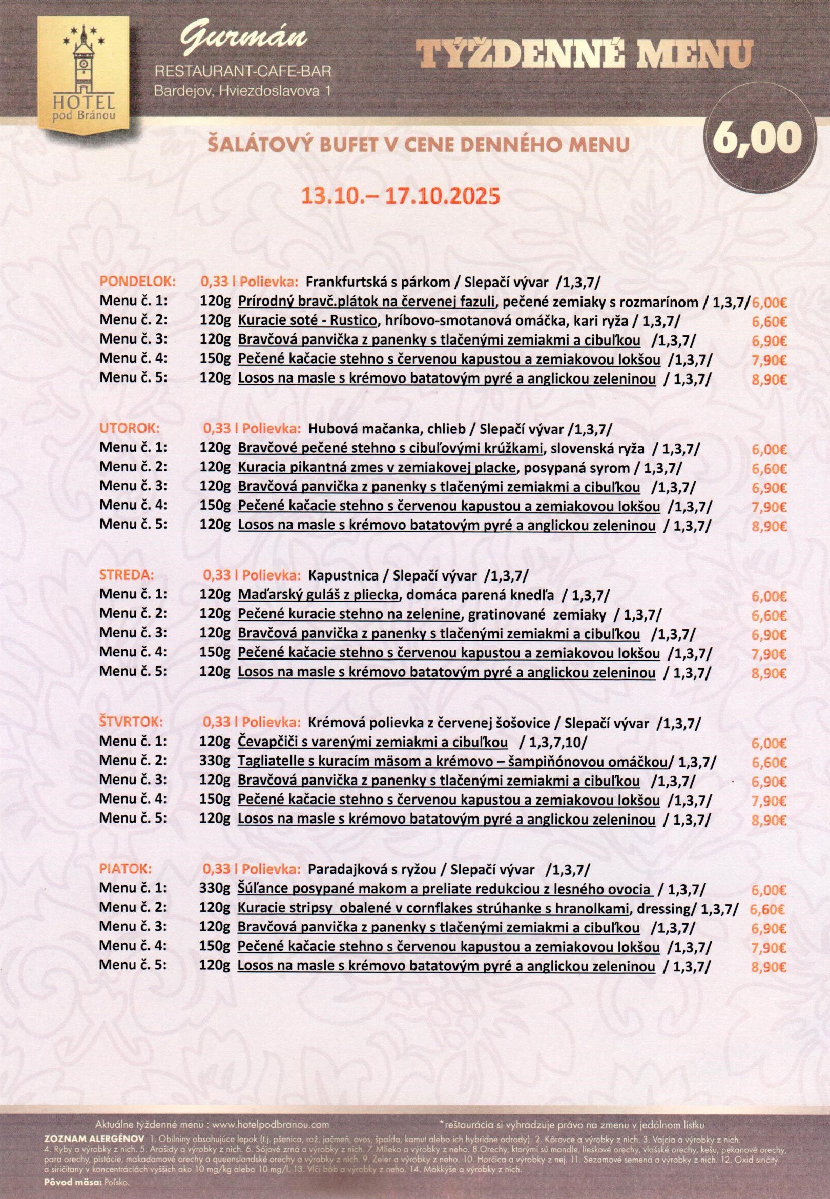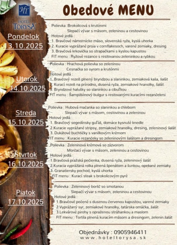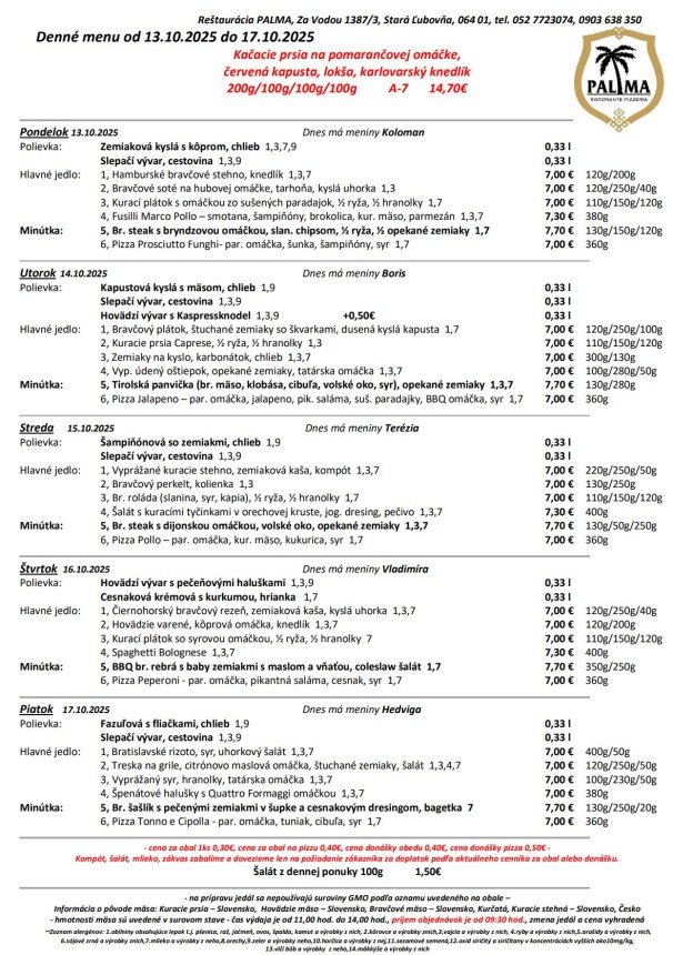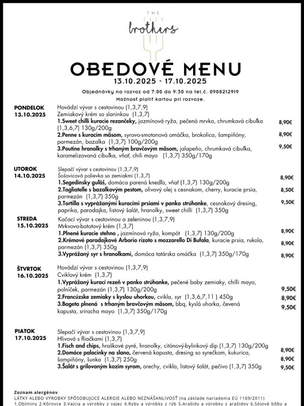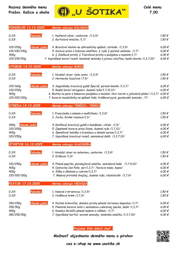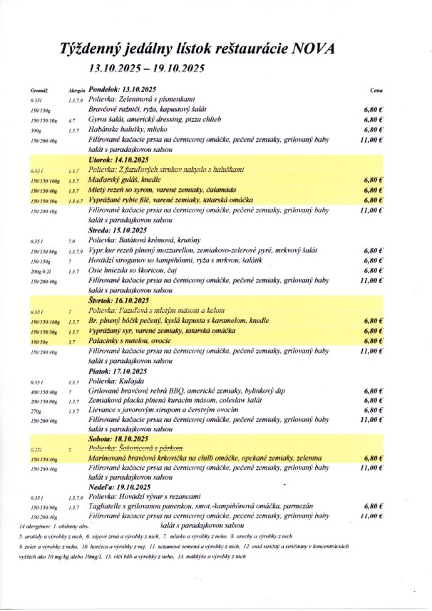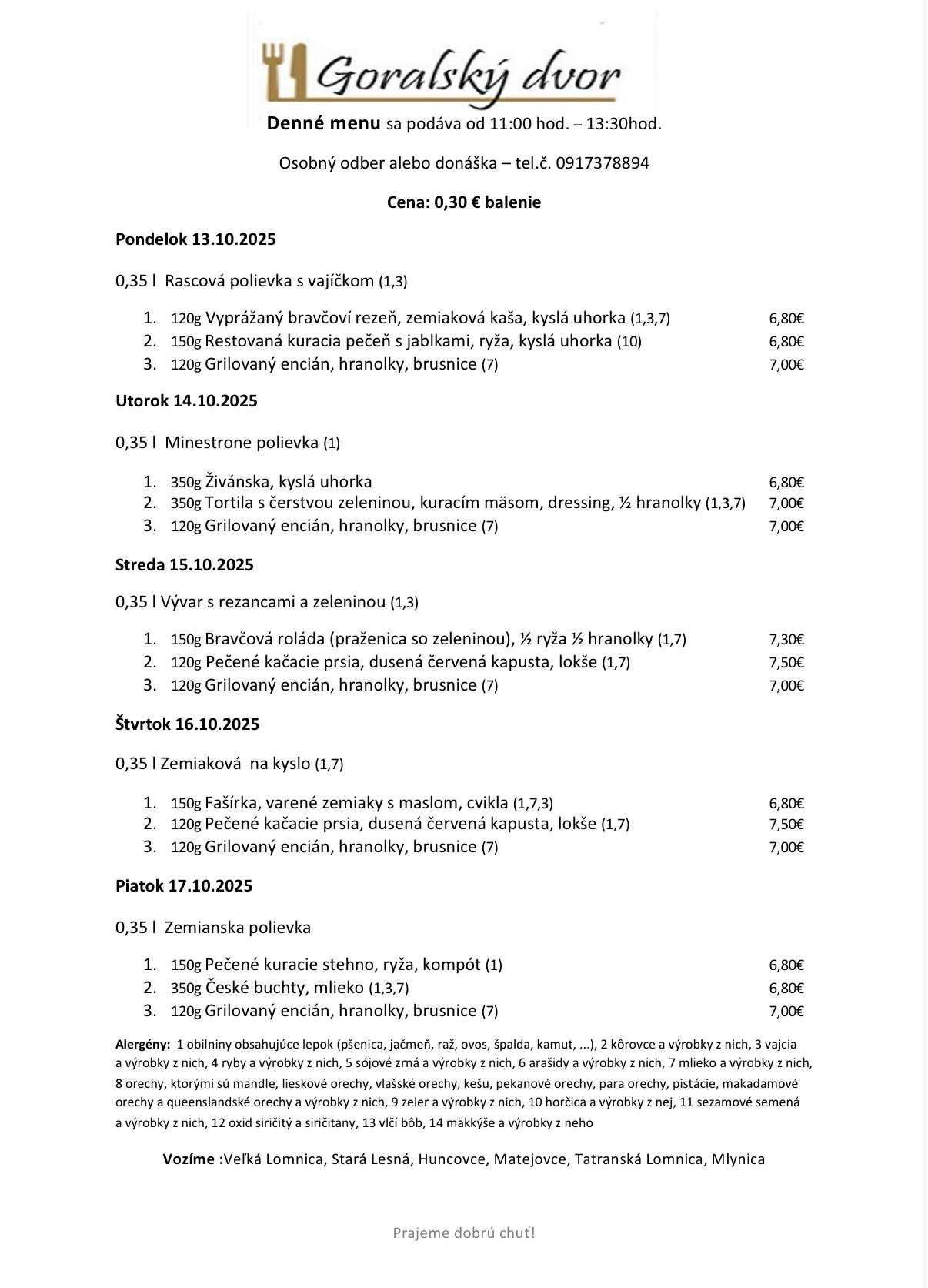 13.10.2025 1. Vývarová s rezancami a zeleninou 0.33l(1, 3, 9)1,40 €2. Maďarská polievka s chlebom 0.4l(1,9)1,90 €1. Tortila sendvič s trhaným bravčovým mäsom /č.cibuľa, rukola/ 340g(1,3,7)6,50 €2. Kurací perkelt 150g, maslové halušky 200g(1, 3, 7)6,50 €3. Vyprážaný bravčový rezeň 150g, domáci zemiakový šalát 200g(1, 3, 7)6,50 €4. Kurací stroganov 120g, ryža, hranolky 200g(1, 3,7)6,50 €5. Pizza Yellow /tomat, oregano, šunka, kukurica, syr/ 320g(1, 7)6,50 €6. Kačacie hody - konfitované kačacie prsia, dusená červená kapusta, mastená lokša 3ks 400g(1,3)9,00 €