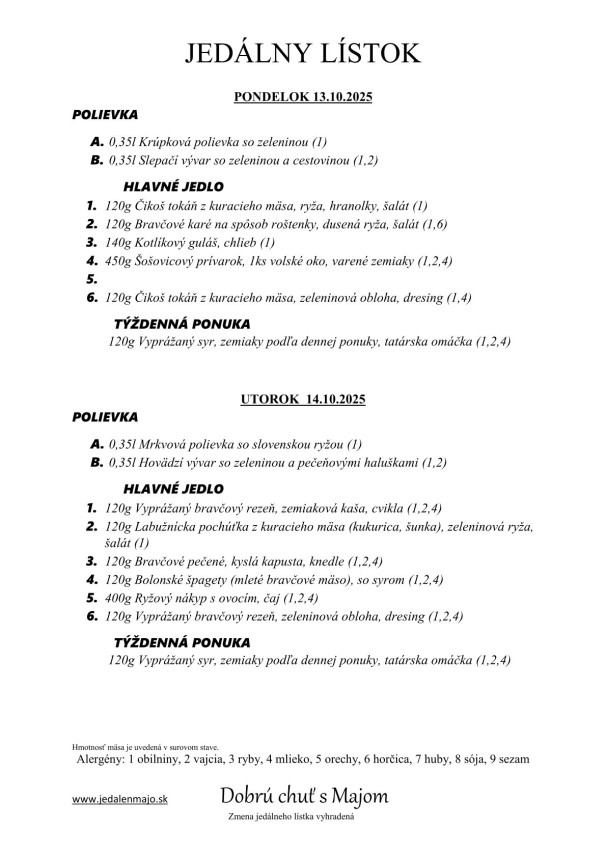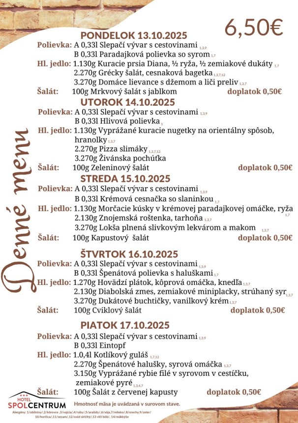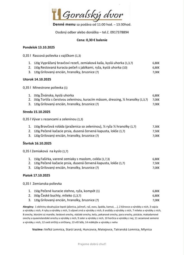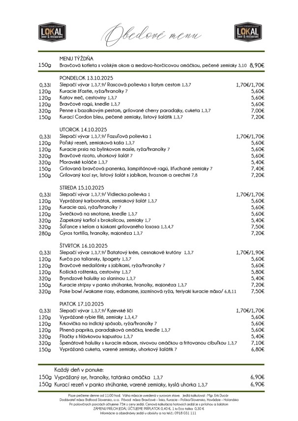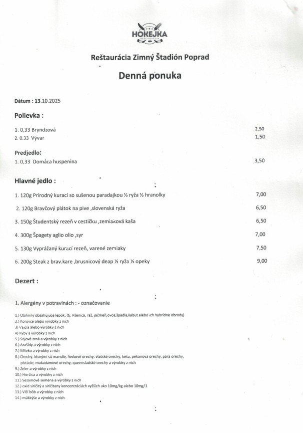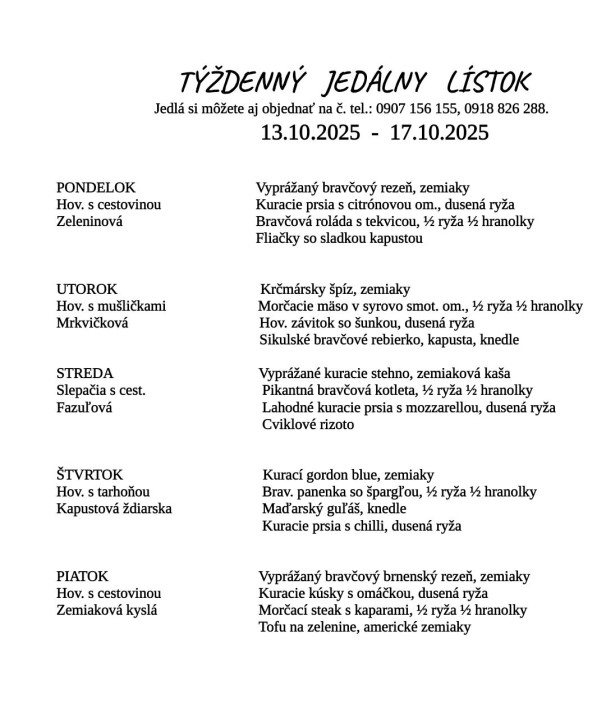 (13. 10. 2025) 0,33 l Slepačia s cestovinou 1,3,7,9 130 g Bravčový stroganov 7 100g/100g Ryža / hranolky 70 g Steriliz. kyslá uhorka Cena: 6,50 €