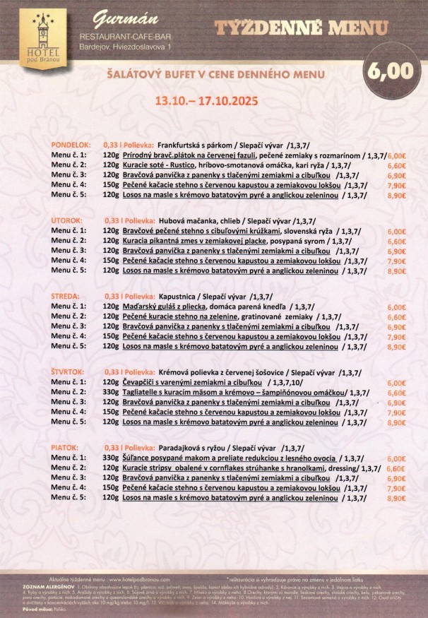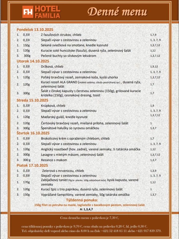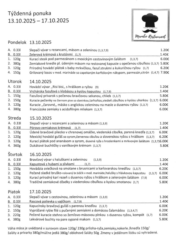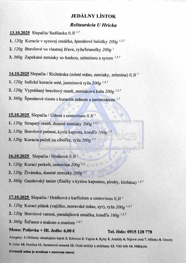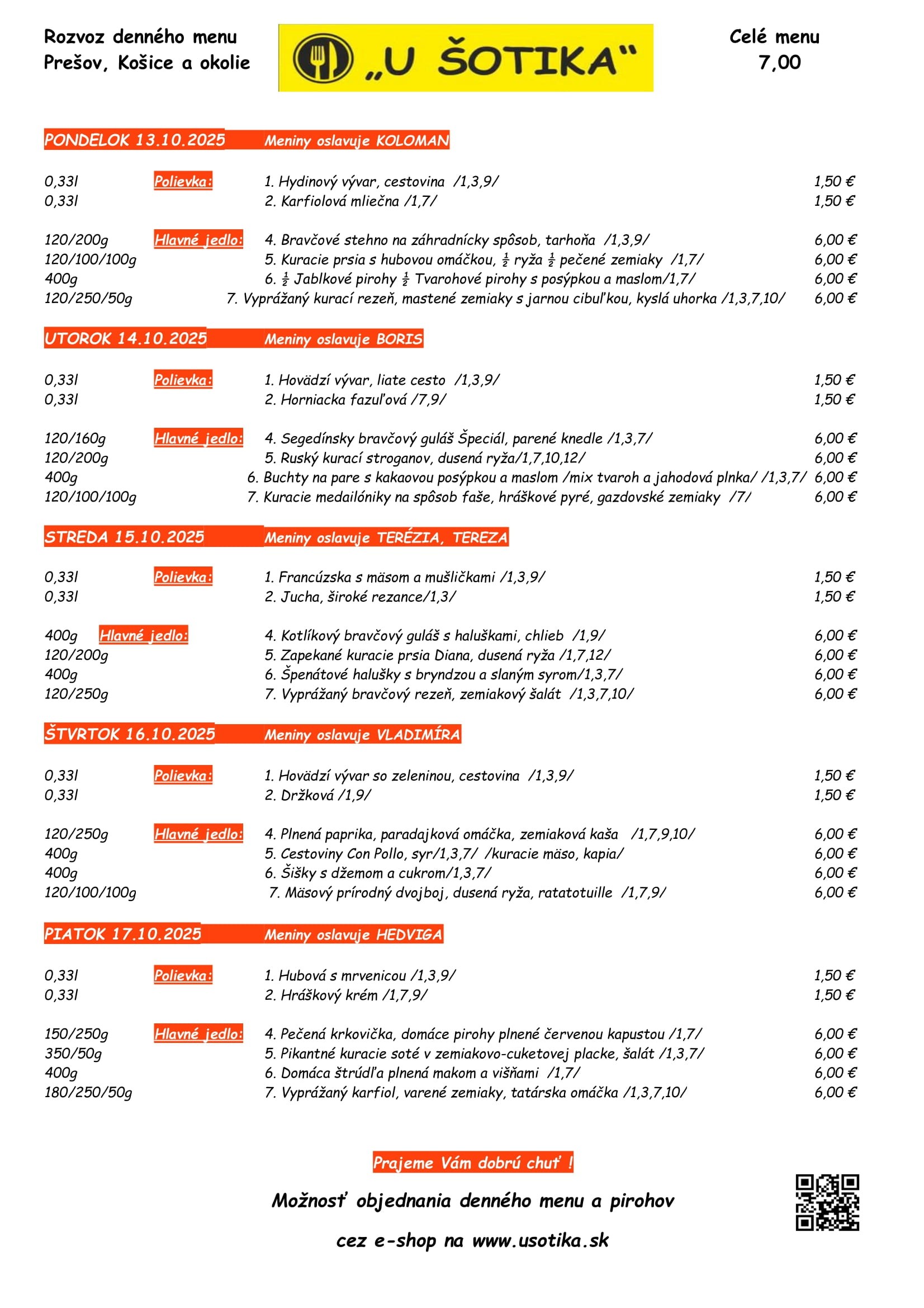 (13. 10. 2025) 0,33 l Slepačia s cestovinou 1,3,7,9 130 g Bravčový stroganov 7 100g/100g Ryža / hranolky 70 g Steriliz. kyslá uhorka Cena: 6,50 €