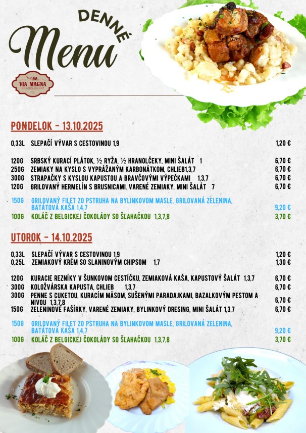 13.10.2025 Polievka 0,35 lŠpenátová s vajíčkom {3, 9} 0,35 lDomáci mäsový vývar s cestovinou {1, 3, 9} 0,50 lDesiatová polievka podľa dennej ponuky, chlieb {1}2,90 € Hlavné jedlo 450 gŠpagety aglio olio e peperoncino {1, 3, 7, 9}8,90 € 450 gGrilovaný kurací steak na zelených fazuľkách, volské oko, ryža {3, 7, 9}9,50 €