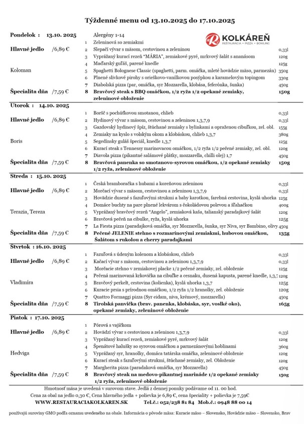 13.10.2025 (Koloman) 0,33l Zeleninová s mrveničkou /A:1/ 0,33l Slepačia s mäsom a cestovinou/alergény:1,3,9/ 1. 63/150/160 Pečené br. pliecko,kyslá kapusta ,knedle/A:1,3,7/ 2. 100/200 Vyprážaný detvianský rezeň,hnietené zemiaky,zelenin.šalát/A:1,3,7/ 3. 63/200 Námornícke mäso,tarhoňa/A:1,3,7/ 4. 160/200 Karfiol so syrovou omáčkou,varené zemiaky/1,7 /