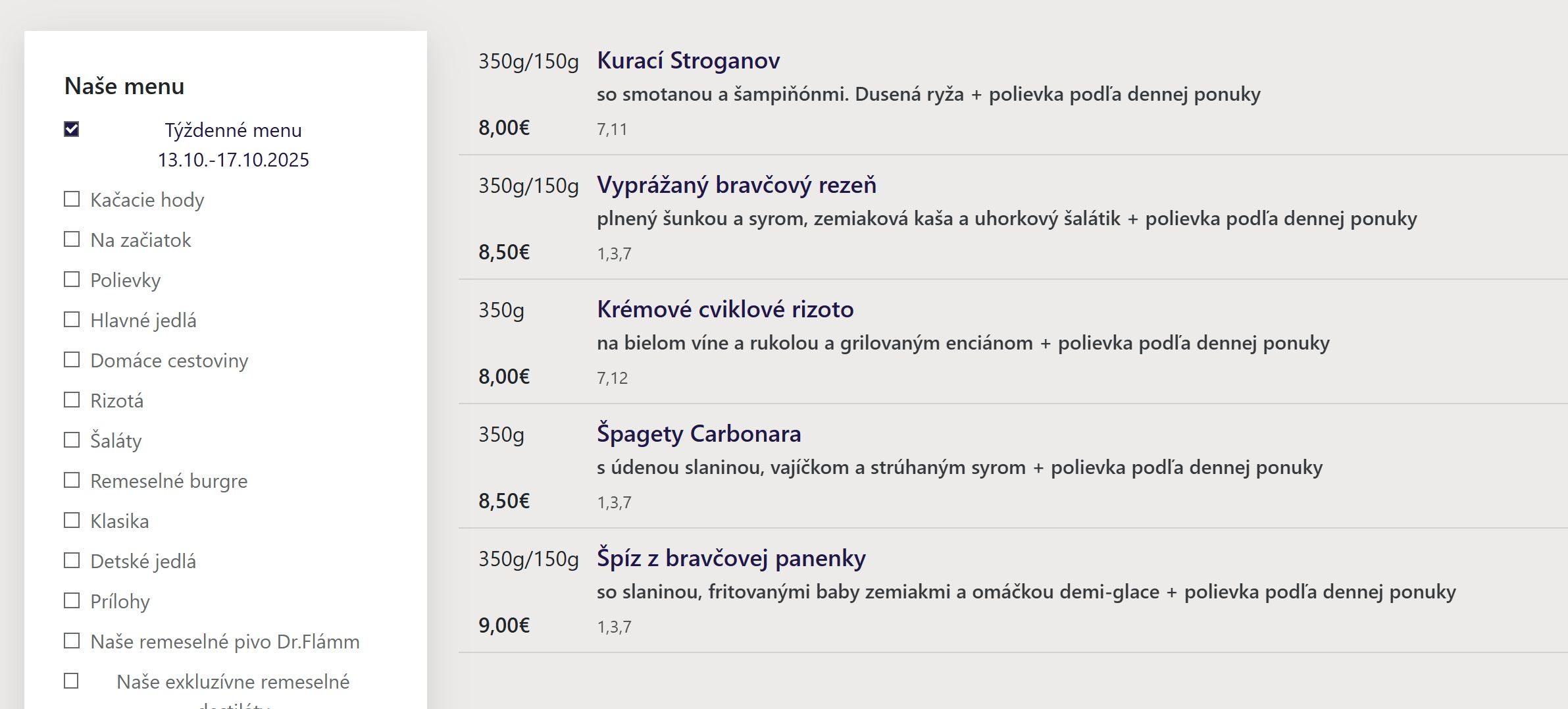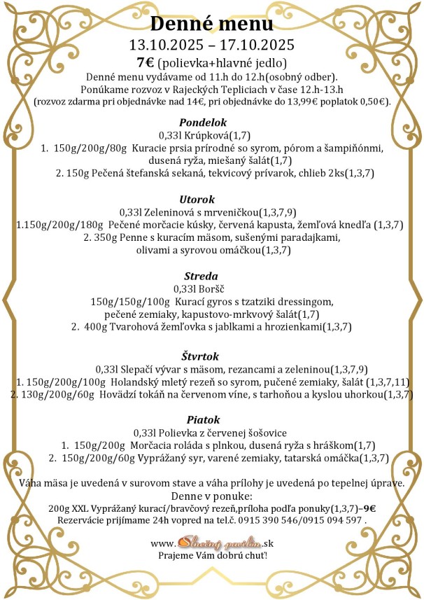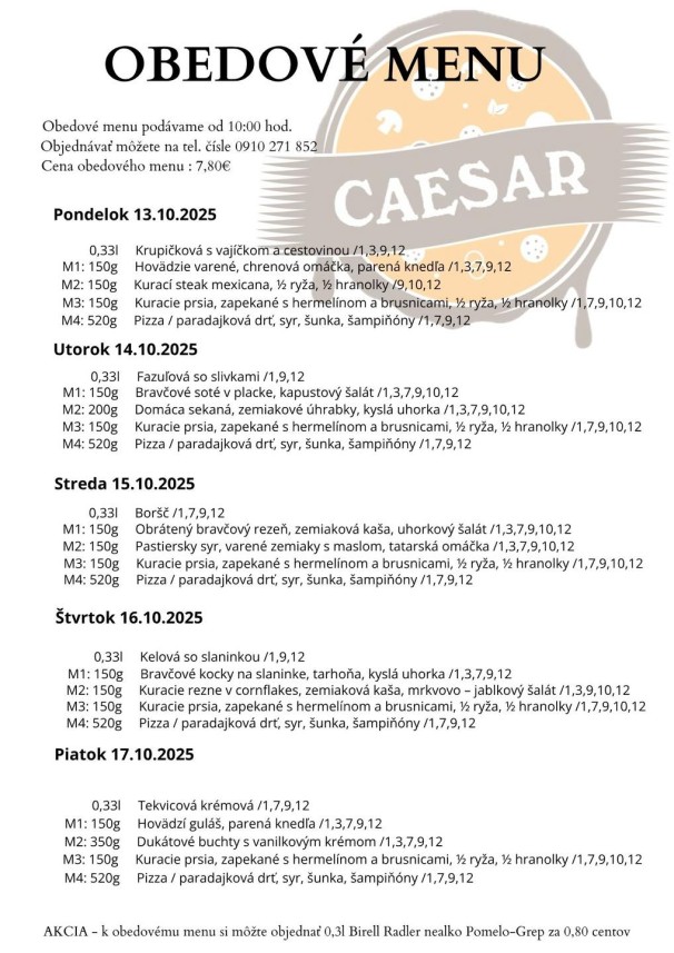 Polievka 0.33l Polievka Hlivová s haluškami (1,3,7)/ slepačí vývar s rezancami (1,9) Hlavné jedlá 1.Menu 150g Bravčová panenka, dubáková omáčka so smotanou, brusnice, šťuchané zemiaky (1,3) 2.Menu 300g Tvarohová žemlovka s lesním ovocím a čokoládou (1,3,7) 3.Menu 150g Ceasar šalát s kuracím mäsom (7)