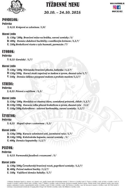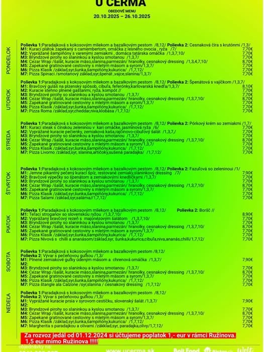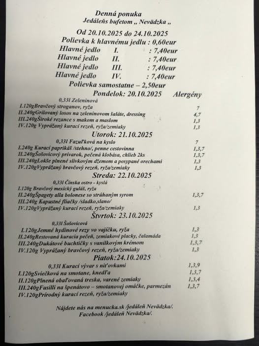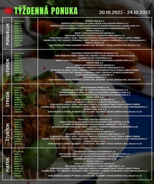 (24.10.2025) Polievky: (250ml) Šošovicová na kyslo/1,7/, (250ml)Slepačí vývar s rezancami/1,3,9/, (250ml)Paradajková s parmezánom /7/ 1.50 € MENU 1: Kurací čiernohorský rezeň so strúhaným syrom, príloha, šalát/dresing /1,3,7/250g 7.50 € MENU 2: Bravčová panenka s hríbikovou omáčkou, príloha, šalát/dresing /6,7/ 250g 7.90 € MENU 3: Morská šťuka zapečená s paradajkou a baby špenátom, príloha, šalát/dresing /4/ 250g 8.50 € MENU SLADKÉ: Palacinky s čučoriedkovým lekvárom a mascarpone krémom /1,3,7/ 250g 7.20 € MENU KLASIKA: Pečené kuracie stehno, príloha, kompót /0/ 250g 6.90 € MENU ŠPECIÁL: Pečené bravčové rebierka BBQ, príloha, šalát/dresing /0/ 250g 7.90 € PRÍLOHY: RYŽA, PEČENÉ ZEMIAKY, VARENÉ ZEMIAKY /7/, HRANOLKY, GRILOVANÁ ZELENINA ŠALÁTY: MRKVOVÝ, UHORKOVÝ, ČALAMÁDA, KYSLÉ UHORKY, ZAVÁRANÁ CVIKLA, BROSKYŇA DRESINGY: MED – HORČICA /10/, KEČUP, TATÁRSKA OMÁČKA /3,10/, CESNAKOVÝ /7/, BRUSNICE