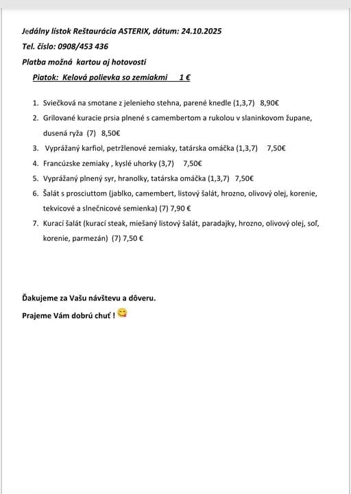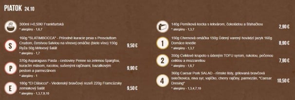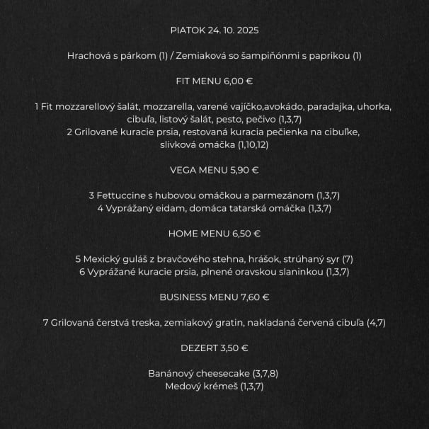 (24.10.2025) POLIEVKA 1.50 €(0,33l) KARFIOLOVÝ KRÉM ŠPECIALITA 9.90 €(120g) GRILOVANÝ LOSOS, OMÁČKA ZO SUŠENÝCH PARADAJOK (200g) LINGUINE,SYR Alergény: 1,3,4,7 MENU 1 6.90 €(100g) VYPRÁŽANÝ BRAVČOVÝ REZEŇ (200g) ZEMIAKOVÝ ŠALÁT Alergény: 1,3 POLIEVKA €() DELENÁ STRAVA 6.90 €(260gr) PEČENÉ KURACIE STEHNO NA GYROSE (200g) PEČENÁ ČERVENÁ REPA MENU 2 6.50 €(100g) FLORENTÍNSKY KURACÍ REZEŇ SO ŠPENÁTOM A SYROM (150g) DUSENÁ RYŽA Alergény: 7 ŠALÁT 1.60 €(160g) VÝBER Z DENNEJ PONUKY MENU 3 €() MENU 4 6.50 €(350g) JAHODOVÉ PARENÉ BUCHTY S KAKAOM A MASLOM Alergény: 1,3,7