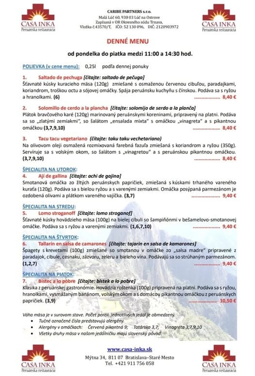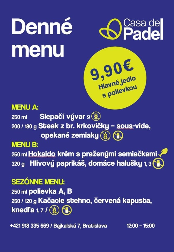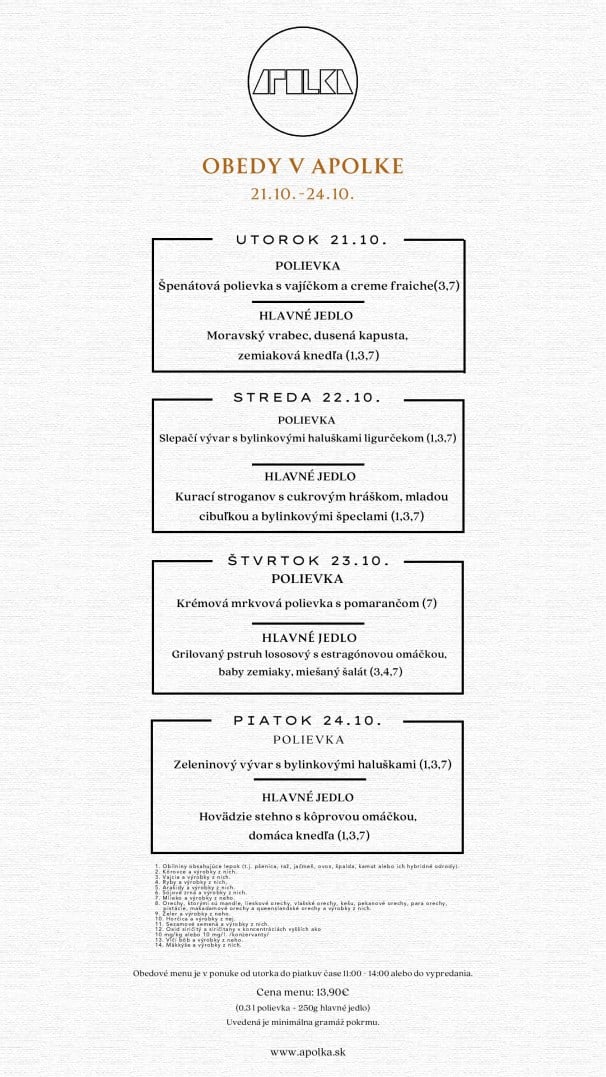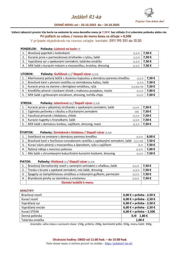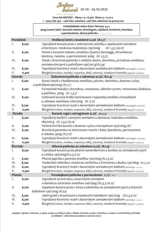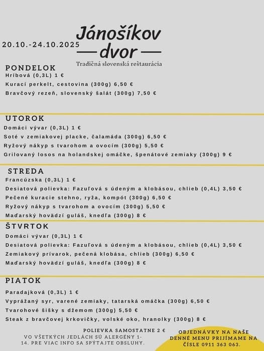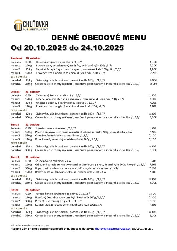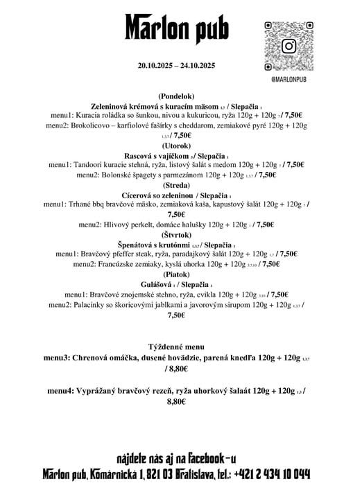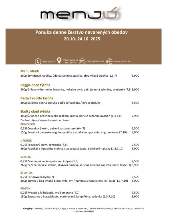 24.10.2025 Polievka MINESTRONE s paradajkami, zeleninou, fazuľkou a cestovinou /1,9/ 1. Restované kačacie pečienky na cibuľke a červenom víne, dusená ryža, kyslé uhorky 9.50€. /12/ 2. Grilovaný syr Halloumi, tekvicové pyré, listový šalát, opečené jadierka a vlašské orechy 9.50€. /7,8/ PONUKA DŇA: Grilovaná štvrť s farmárskeho kuraťa, dusená ryža, šalát Coleslaw 9.90€. /3,7,9,10/ TÝŽDENNÁ PONUKA JEDÁL: Polievka podľa dennej ponuky Vyprážaný bravčový /karé/ alebo kurací rezeň /prsia/, domáci slovenský zemiakový šalát s cibuľkou 11.90€. /1,3,7,9/ Polievka podľa dennej ponuky Vyprážaný syr EIDAM, varené zemiaky s maslom, domáca tatárská omáčka 11.50€. /1,3,7,9,10/ Polievka podľa dennej ponuky Grilovaný cyperský syr HALLOUMI, batatové hranolky, smotanový cream fresh s kôprom 12.50€. /7/ Polievka podľa dennej ponuky Vyprážaný filet z bielej tresky, slovenský zemiakový šalát alebo varené zemiaky s maslom 10.90€. /1,3,4,7,9/ Polievka podľa dennej ponuky Vyprážaný karfiol, varené zemiaky s maslom, domáca tatárská omáčka 10.90€. /1,3,7,9,10/