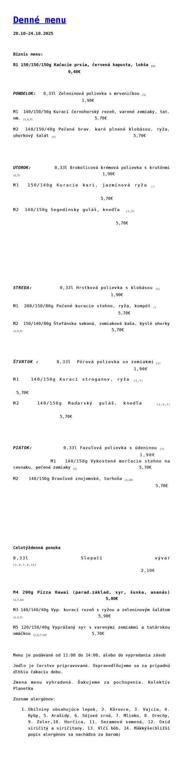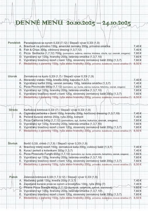 : 24.10.2025 Polievky: Slepačia so zeleninou a celest. rezancami (1,3,9), Hráškový krém (1,7) 1. Vypr. kuracie prsia plnené šunkou a chedarom v sezamovej strúhanke, ryža a op. zemiaky, šalát (1,3,7) 7,70 € 2. Čevapčiči s varenými zemiakmi, horčicou, cibuľou a kyslou uhorkou (3) 7,50 € 3. Palacinky plnené vanilkovým tvarohom s horúcim ovocím a čokoládou (1,3,7) 7,50 € 4. Pizza Quattro Stagioni/ Margharitta s artičokmi, olivami a šamp. (1,7) 7,60 € 5. Zeleninový šalát s gril. hov. roštenkou, franc. dress., olivami a op. toastom (1,3,7) 7,50 € 6. Hovädzie ragú s koreňovou zeleninou, ryža 7,70 € ŠPECIÁLNE MENU: 200 g Vyprážaný bravčový / kurací rezeň, 1/2ryža 1/2hranolky, šalát (1,3,7) 8,50 € 150 g Vyprážaný syr s hranolkami a domácou tatárskou omáčkou(1,3,7) 8,50 € 200g Čiernohorský rezeň, pečené zemiaky, šalát(1,3,7) 9,00 € 250g 1/4 Pečenej kačice s dusenou červ. kapustou, 1 ks lokša a domáce zemiakové knedle (1,3,7) 12,90 € 350g Pečený Heik, kyslá obloha, chlieb 10,90 € 200g Grilované kuracie prsia s pestom, 1/2 ryža, 1/2 op. zem., šalát (5) 8,50 €