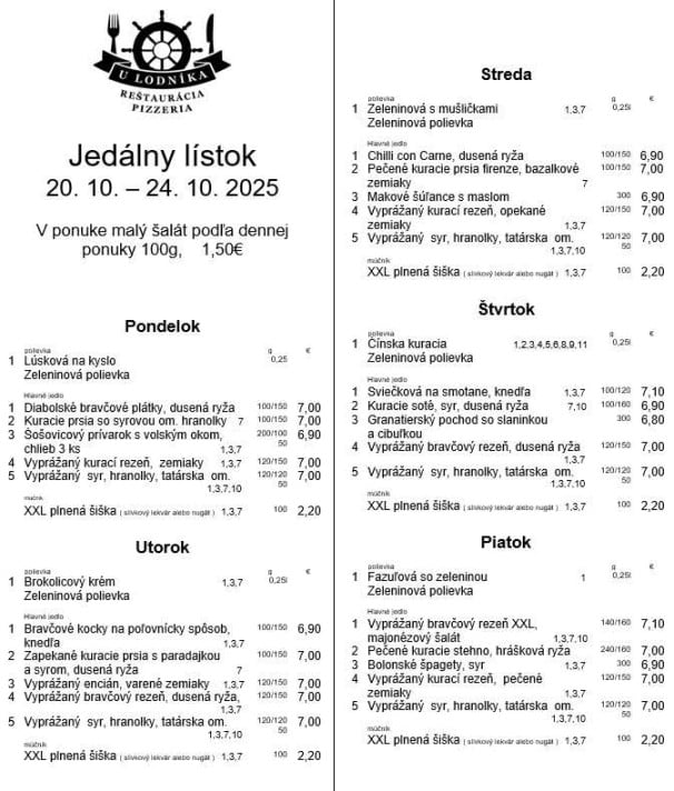 24.10.2025 0,33l (1,7) Lúsková na kyslo 120g (1,7) 1. Kurací plátok zapekaný so syrom a šunkou, smotanová omáčka, viedenská cibuľka,ryža alebo zapekané zemiaky,šalát 7,90 € 120g (1,3,7) 2. Vyprážaný Bravčový rezeň,ryža alebo zapekané zemiaky,šalát 7,90 € 150g (1) 4. Ramsteak,demiglac,ryža alebo šťúchané zemiaky 9,90 €