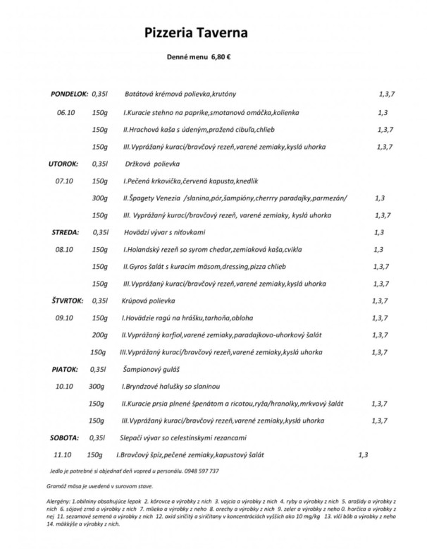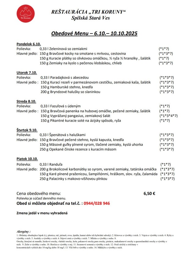 Menu 7,- € Polievka : Podľa denne ponuky Hotové jedlo : Podľa dennej ponuky www.restauracia.eu 0907 / 940 609 053 488 44 88 Dobrú chuť praje rodina Rusňáková so svojim personálom Alergény: 1-obilniny,2-kôrovce,3-vajcia,4-ryby,5-arašidy,6-sója, 7-mlieko,8-orechy,9-zeler,10-horčica11-sezam,12siričitany.13-mäkkýše pastedGraphic 2.00 € REŠTAURÁCIA , PENZIÓN – HUBERT CENA OBEDU pre rok 2025 : 6 ,- € Obed je možné kombinovať podľa vášho výberu : Ceny sú uvedené s 5 % DPH . Prajeme Vám dobrú chuť . Tel : 053 488 44 88 0907 940 609 info@restauracia.eu www.restauracia.eu Objednávať od 07,00 hod do 10,00 hod. Ďakujeme Informácie na uvedenom čísle // 0907 940609 053 / 4 88 44 88 Dobrú chuť Vám praje rodina Rusňáková zo svojim personálom . Ponúkame: Sme s vami od začiatku – krstiny prijímania oslavy stretnutia svadby do konca – kary