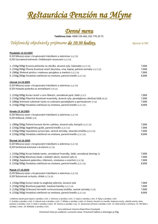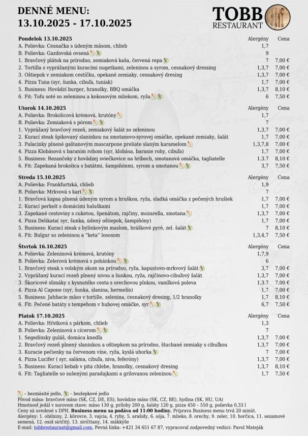 Hokaidó polievka (1) 1. Steak z panenky s dubákovou omáčkou, ryža (7) 2. Katov meč, zemiaková placka (1,3,7) 3. Boloňské špagety (3,7) 4. Pizza, salámová (1,3,7) 5. Zeleninový šalát, kuracie mäso, cvikla, zálievka (10) Cena menu č.1 - 9,- €, č.2,3 - 7,90 €, č.4, 5 - 7,- € Donáška 1,00 € Zabalenie menu 0,45 €