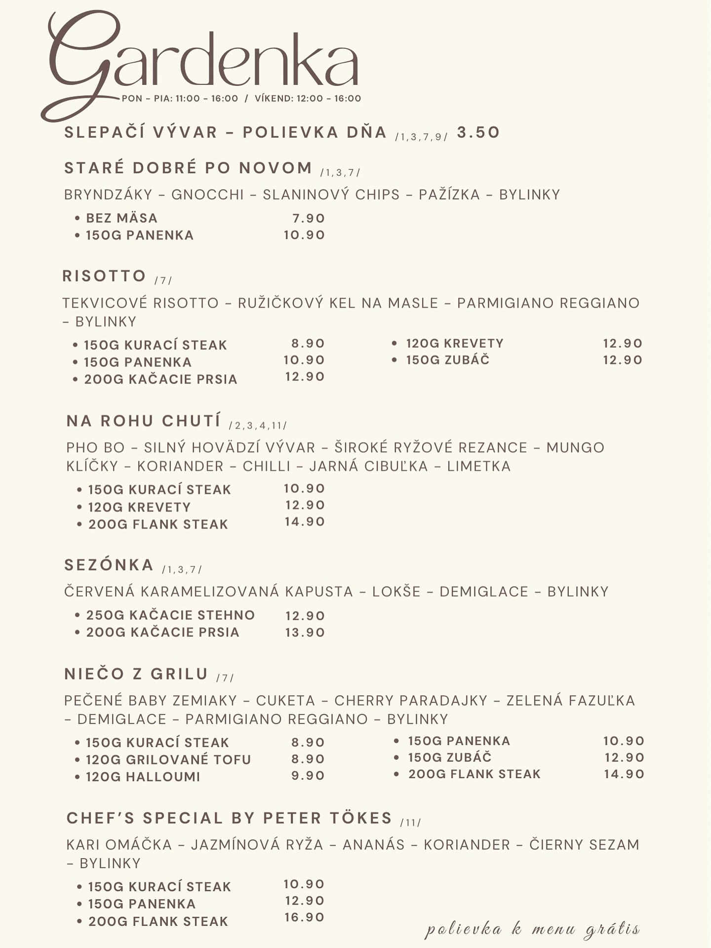 10.10.2025 Polievka: 400 ml Sedliacka polievka 1, 9 400 ml Kurací vývar so zeleninou a rezancami 1,3,9 Jedlo: 120/200g Zapekaný kurací plátok s hruškou a nivou, ½ ryža, ½ hranolky 1, 7 120/200g Vyprážané rybie filé, domáci zemiakový šalát 1, 3, 4, 7, 12 330g Živánska na plechu, cvikla 3 120/200g Bravčový maďarský guľáš, domáca parená knedľa 1, 3, 7 330g Palacinky plnené tvarohom a hrozienkami, preliate čokoládovým topingom 1, 3, 7