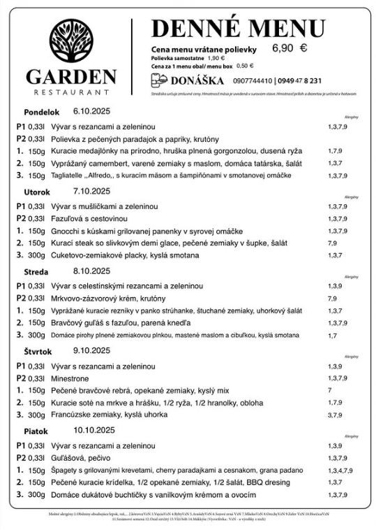 Polievky 1. 0,33 Hovädzia s cestovinou /1,3,9/ 2. 0,33 Guľášová /1/ Polievky v hodnote 3,00 € 1. 0,33 Držková, 2 ks chleba /1/ . Špeciálna ponuka v hodnote 6,30 € 1/2 porcia 5,60€ / čakacia doba 15 – 20 min./ 320 g Pirohy plnené džemom 320 g Pirohy plnené tvarohom 320 g Pirohy plnené zemiakmi 320 g Tatarčané pirohy plnené tvarohom 320 g Tatarčané pirohy plnené zemiakmi /1,3,7/ . Doplatky 2 dl cmar 1,00€ 50 g kyslá smotana, škvarky, cibuľa 0,90€ . Hotové jedlá v hodnote 6,30- 1/2 porcia 5,60 € 1. 280 g Lievance s džemom /1,3,7/ Hotové jedlá v hodnote. 6,30 € - 1/2 porcia 5,60 € 1.120 g Sekaná sviečková, knedle /1,3,7,9,10/ 2.120 g Bravčové kocky na korení, varené zemiaky, šalát /1/ 3.120 g Živánska z bravčového mäsa, kyslá uhorka /1/ 4.120 g Stehenné kuracie soté v sladkej chilli omáčke, ryža, obloha 5.120 g Grilované kuracie jazýčky, ½ ryža, ½ hranolky, obloha/1,7/ 6.120 g Vyprážaný syr, hranolky, tatárska omáčka, obloha /1,3,7 . .Špeciálna ponuka v hodnote 7,60 € - ½ porcia - 6,90 € / čakacia doba 15 – 20 min./ 1.150 g Grilované kuracie jazýčky na farebnom zeleninovom šaláte, dresing /1,7/ 2.150 g Kurací rezeň Gordon Blue, varené zemiaky, obloha /1,3, 3.150 g Viedenský kurací rezeň, pečené zemiaky, šalát /1,3,7,11/ 4.150 g Bulharský bravčový rezeň, varené zemiaky, obloha /1,3,7 5.150 g Vyprážaný syr so šunkou, hranolky, tatárska omáčka /1
