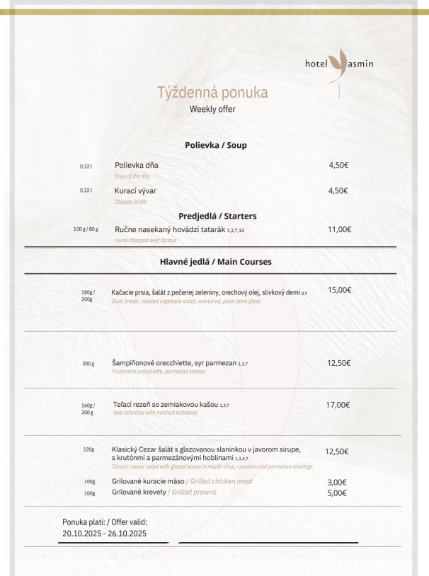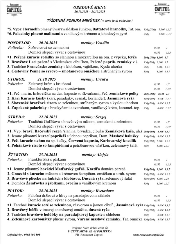 Cuketová polievka so zemiakmi a kôprom /cuketa, zemiaky, koreniny, smotana, kôpor, mlieko, múka/ M1 Kuracie zapekané so šunkou a syrom, dusená ryža /kur.prsia, šunka, eidam, múka, koreniny, ryža/ 7.20 € M2 Hovädzí guláš so zeleninou, kolienka /hov.mäso, cibuľa, cesnak, lečo, koreň.zelenina, koreniny, cestoviny/ 7.90 € M3 Buchty na pare plnené lekvárom, kakaová posýpka /kvások, múka, vajce, lekvár, kakao, cukor, maslo/ 7.20 € M syr Vyprážaný syr, hranolky, tatárska omáčka, obloha /eidam, múka, vajce, strúhanka, hranolky, tatárska omáčka/ 7.20 € M Pizza Quattro formaggi /múka, droždie, parad.základ, štyri druhy syra/ 7.20 €