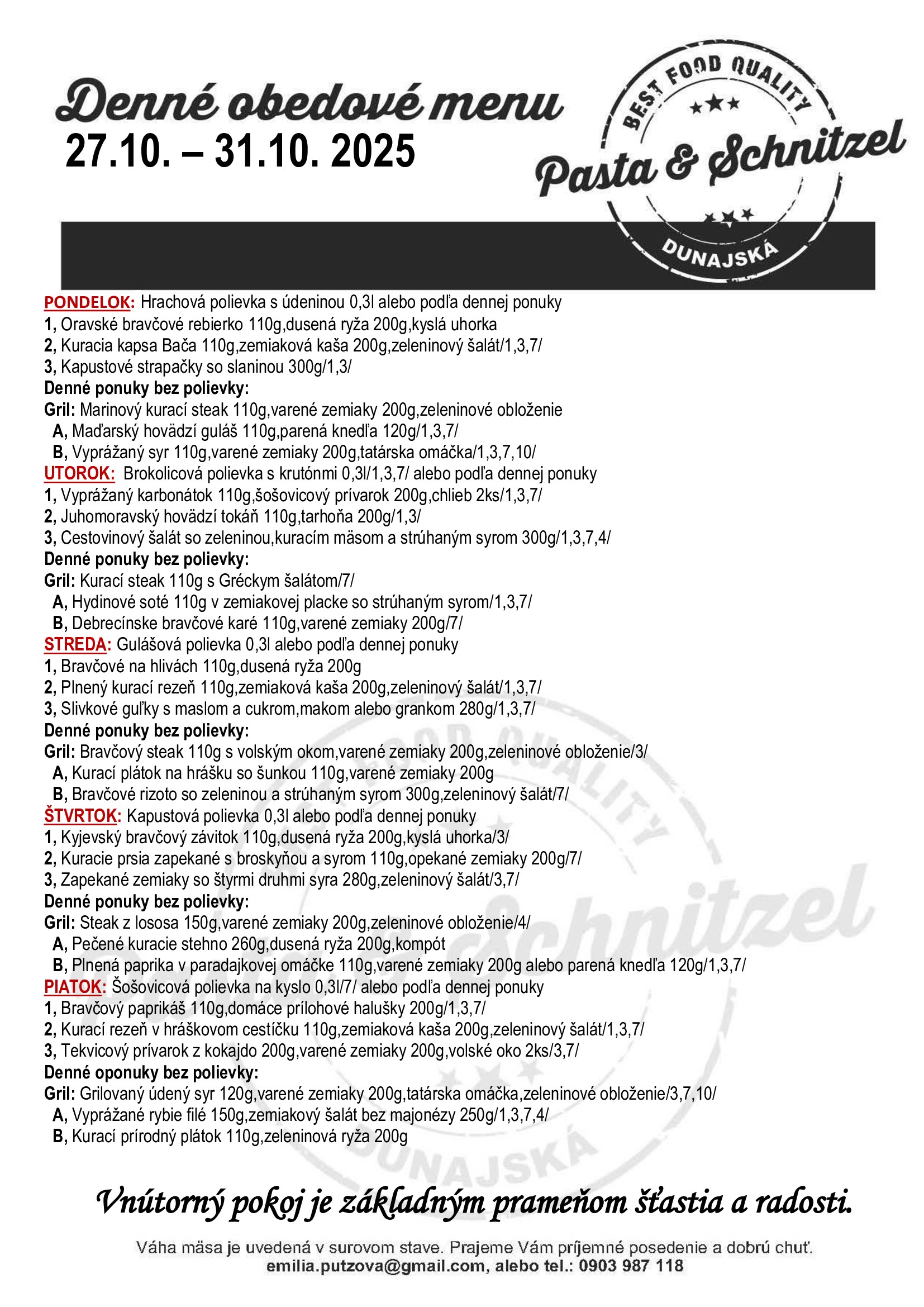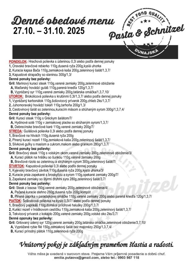 Polievky Poctivý kurací vývar, koreňová zelenina, rezance /1,3,7/0,2l 2.10 € Krém z pečeného cesnaku, paprikové krutóny /1,7/ 0,2l 2.10 € Hlavné jedlá Zapekaná cuketa, zeleninové ragú, strúhany syr, malý miešaný šalát /7/ 350g / 8.90 € ♡Vyprážané kurací cordon bleu, zemiakové pyré, paradajkový šalát /1,3,7/ 180g / 8.90 € Bravčová panenka v slaninke, zemiakový gratin, demi glace omáčka /3,7/ 150g 9.90 € Hovädzí stroganov s kyslou uhorkou, šampiňónmi a ryžou /7/ 150g / 9.90 € Cviklové rizoto s grilovaným kozím syrom a vlašskými orechami /7,8/ 350g / 10.90 €