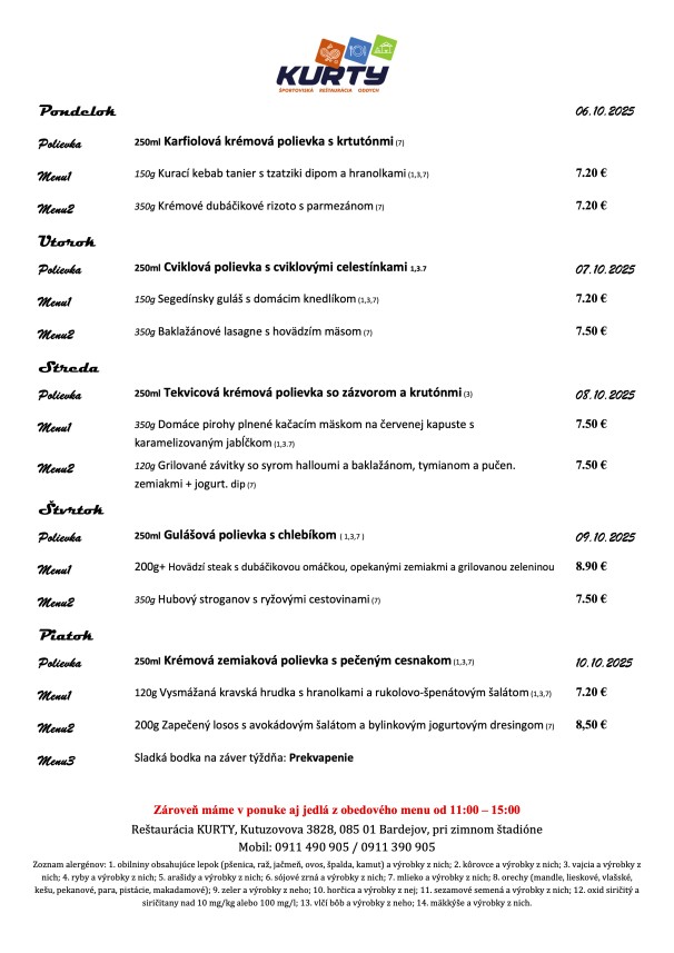 Polievka 0,33 l Polievka krúpková so zeleninou /1,3,9 / Hlavné jedlá 1/ 150g Sedliacke bravčové karé, pečené zemiaky /1,9/ 7.00 € 2/ 350g Špenátové halušky v syrovo-smotanovej omáčke /1,3,7 9/ 6.50 € V ponuke každý deň na objednávku: 1/ 150g Vyprážaný bravčový rezeň, varené zemiaky, obloha /1,3,7/ 8.00 € 2/ 150g Prírodný bravčový rezeň, varené zemiaky, obloha /1,3,7/ 8.00 € 3/ 150g Vyprážaný kurací rezeň, varené zemiaky, obloha /1,3,7/ 8.00 € 4/ 150g Prírodný kurací rezeň, varené zemiaky, obloha /1,3,7/ 8.00 € 5/ 150g Vypr. syr, hranolky, tatárska omáčka /1,3,7/ 8.50 € 6/ 350g Šalát ARTIN / s kuracím mäsom /1,3,7/ 8.00 € 7/ 350g Šalát BALKÁN /s balkánskym syrom /1,3,7/ 8.00 € 8/ 350g Šalát TUNA /s tuniakom /1,3,7/ 8.00 €