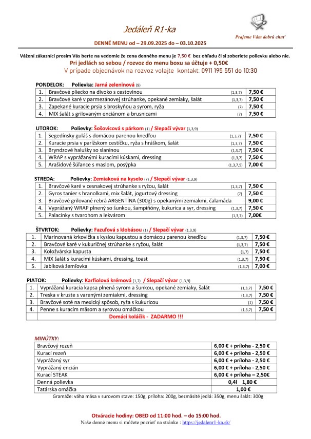 0,33l Slepačí vývar so zeleninou, rezancami a mäsom (1,3,9) 1.90 € 0,33l Lusková na kyslo, chlieb (1,3,7) 2.40 € 150g Vyprážaný morčací rezeň, majonézový šalát (1,3,7,10,12) 8.30 € 150g Medajlonky z panenky Dr. Labudu, hranolky (6,7,10) 8.00 € 150g Kuracie soté so šunkou a kukuricou, ryža, paradajka (1,7) 7.90 € 250g Pečené kačacie stehno, dusená červená kapusta, kysnutá knedľa (1,3,7,12) 12.20 €