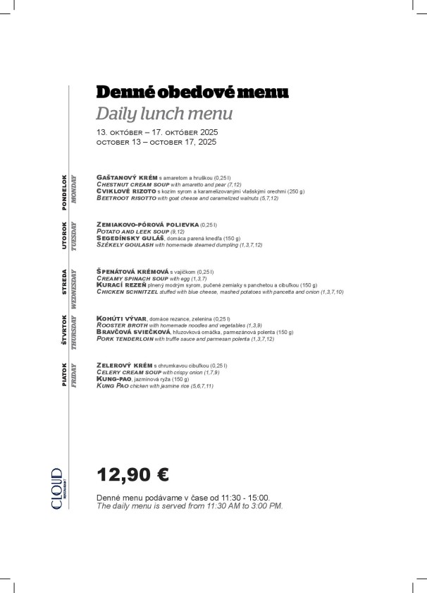 Cloud Restaurant – Fine Dining & Obedové Menu v Srdci Bratislavy Cloud Restaurant je moderná a elegantná reštaurácia situovaná v prestížnom hoteli DoubleTree by Hilton Bratislava. Ponúkame jedinečný gastronomický zážitok, kde sa snúbi špičková kvalita surovín, precízna príprava jedál a prvotriedny servis. Od teraz prinášame aj denné obedové menu, ktoré je ideálnou voľbou pre rýchly, no kvalitný obed v príjemnom prostredí. Či už hľadáte business lunch, gurmánsky zážitok alebo pohodové stretnutie s priateľmi, Cloud Restaurant vám vždy ponúkne výnimočné jedlá a starostlivosť na najvyššej úrovni. ✔ Štýlový interiér & terasa ✔ Prvotriedna gastronómia ✔ Denné obedové menu z kvalitných surovín ✔ Skvelá poloha s bezplatným parkovaním Navštívte nás a objavte chuť dokonalosti v Cloud Restaurant. DoubleTree by Hilton Bratislava Otvorené denne do 23:00Doplňujúce informácie