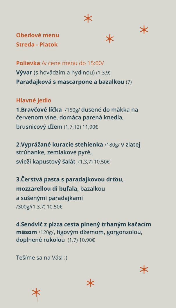 ku obľúbenýmPozrite si denné menu najbližších reštaurácií.