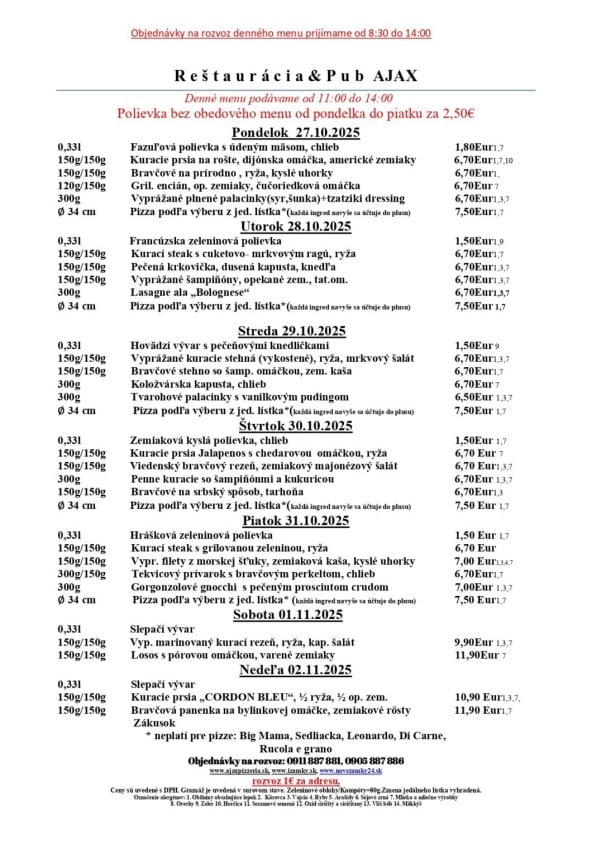 (27. 10. 2025) Polievka: 400 ml A. Fazuľová na kyslo, chlieb (1,7) | B. Slepačí vývar (1) Hlavné jedlá: 1. 400 g Mexický guláš so syron, ryža, kyslé uhorky (7) 2. 400 g Syrový špíz so šunkou, varené zemiaky, tatárska omáčka (1,7) 3. 400 g Vyprážaný syr, hranolky, tatárska | Grilovaný Camembert, hranolky, čučoriedkový džem (1,7,3) 4. 400 g Vyprážané kuracie prsia, hranolky (lodičky) alebo ryža, obloha (1,3) 5. 400 g Chicken premiere: kuracie prsia, zelenina, mozzarella, parmezán, pizza chlieb, dressing 6. 400 g Kurací Gyros, zelenina, hranolky alebo ryža, dressing podľa výberu (7) 7. 400 g Horčicovo medový Losos obaľovaný 220g, ½ čerstvá zelenina, ½ hranolky, tatárska 7€ 8. Ø 25 Pizza: paradajkový základ, syr, 2 druhy salám, s kukuricou alebo šampiňónmi