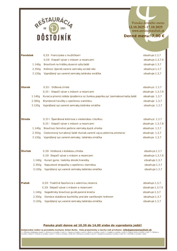 0,25l Zeleninová polievka s mrveničkou/1,3,7/ 0,25l Slovenská cibulačka so syrom/7,9/ 130gKurací gyros so zemiakovými hranolkami a tzatziki šalátikom/7/ 150gKačacia pečienkana cibuľke, domáce zemiakové lokše, kyslá uhorka/1,3/ 280gKrémovéHOKKAIDO rizoto s feta syrom, bazal.pestom a baby špenátom/1,7/