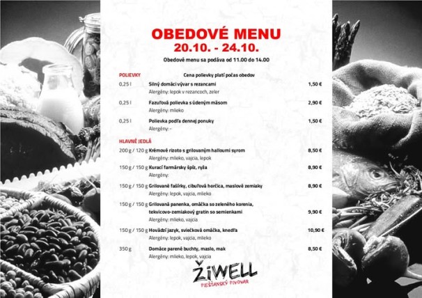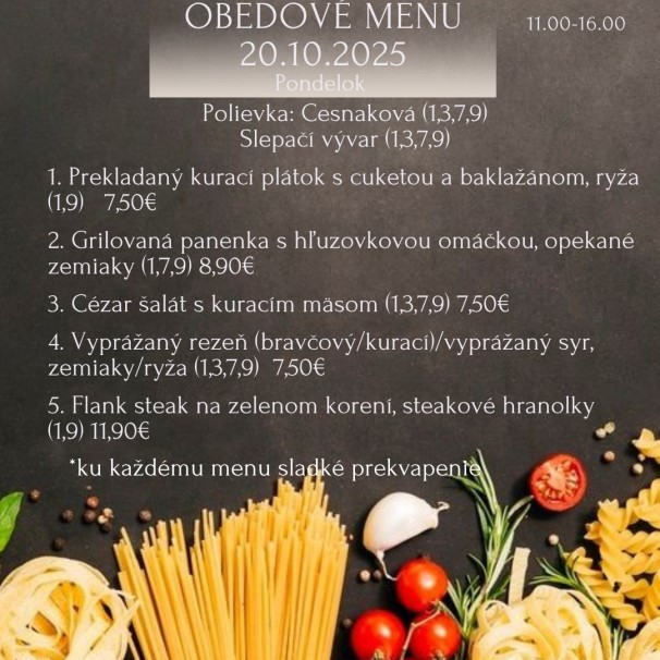 Cesnaková číra polievka so zemiakmi a krutónmi (1,3,9) 1. 150g/150g Hovädzie kocky na hrášku, tarhoňa, kyslá uhorka (1,3,9,10, pôvod mäsa: Slovenská republika) 8,20€ 2. 150g/150g Kurací kebab, zemiakové hranolky, tzatziki (6,7, pôvod mäsa: Slovenská republika) 8,20€ 3. 250g Camembert v lístkovom cestíčku na zeleninovom šaláte (1,3,7,10) 7,20€
