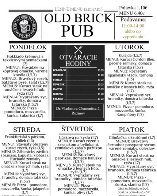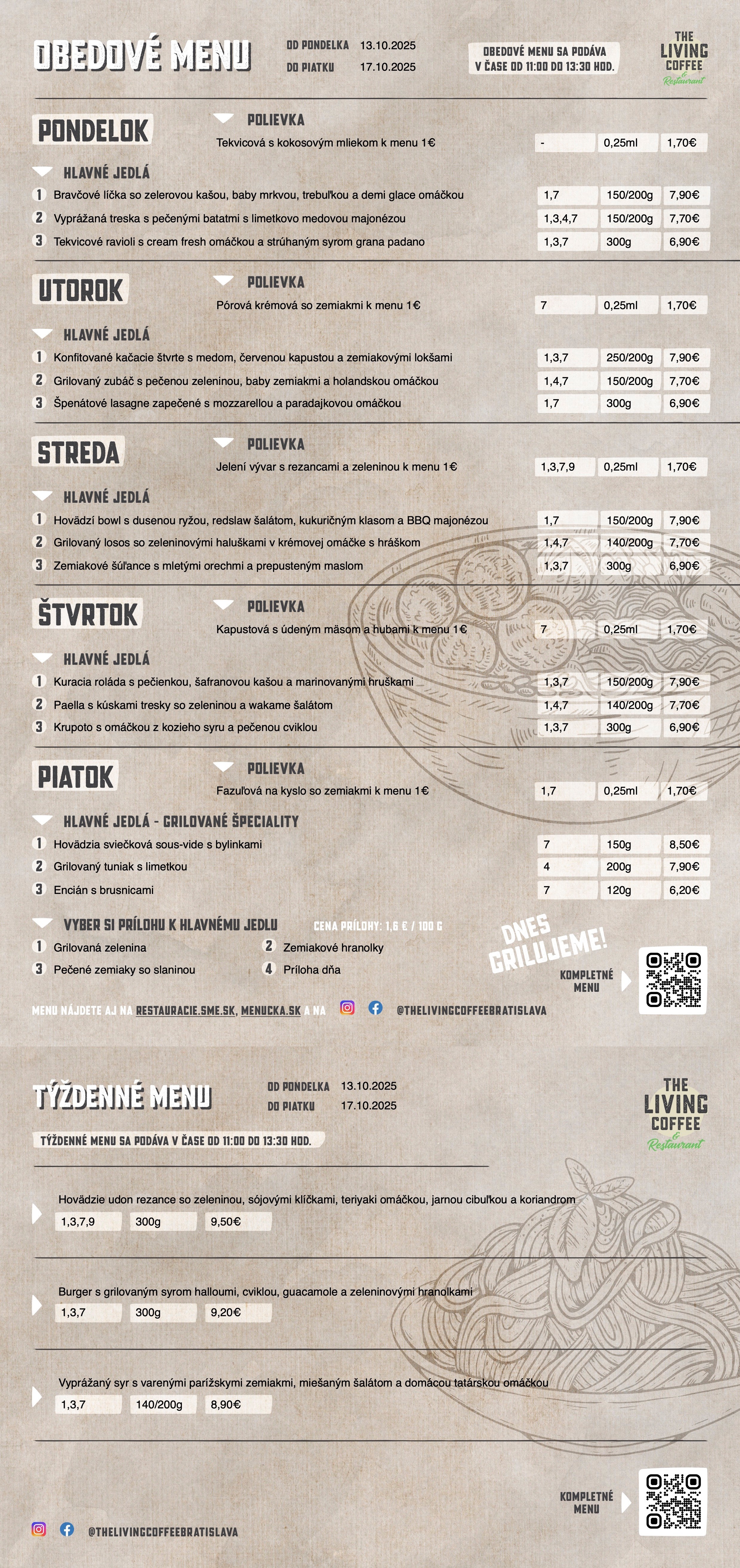 : 18.10.2025 Polievky: Šošovicová so zeleninou a klobásou (1) 1. Grilované kačacie prsia na šípkovej omáčke, tekv.-mrkvové pyré a čerst. šalát (7) 8,00 € 2. Vyprážaný encián s hranolkami, tat. omáčkou a čerst. šalátom (1,3,7) 7,60 € 3. Pizza Sedliacka/ Margharitta s cibuľou, fef., kukuricou (1,7) 7,70 € 4. Parené buchty s makom/ kakaom a horúcim maslom (1,3,7) 7,60€ ŠPECIÁLNE MENU: 200 g Vyprážaný bravčový / kurací rezeň, 1/2ryža 1/2hranolky, šalát (1,3,7) 8,50 € 150 g Vyprážaný syr s hranolkami a domácou tatárskou omáčkou(1,3,7) 8,50 € 200g Čiernohorský rezeň, pečené zemiaky, šalát(1,3,7) 9,00 € 250g 1/4 Pečenej kačice s dusenou červ. kapustou, 1 ks lokša a domáce zemiakové knedle (1,3,7) 12,90 € 350g Pečený Heik, kyslá obloha, chlieb 10,90 € 200g Grilované kuracie prsia s pestom, 1/2 ryža, 1/2 op. zem., šalát (5) 8,50 €