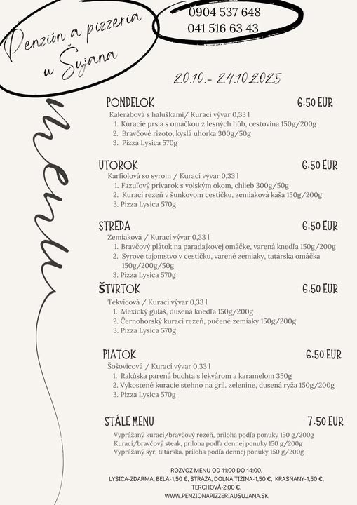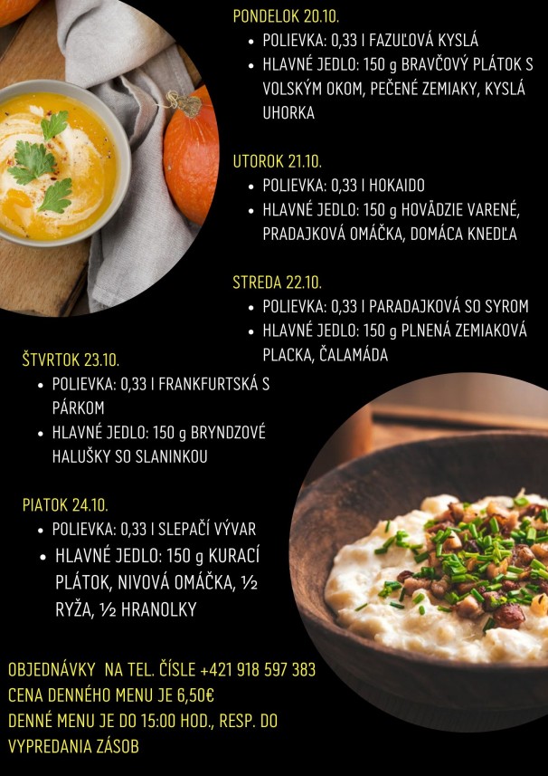 0,33 l Mrkvovo - zelerová polievka (A:1,7,9) 0.80 € 0,33 l Kapustová polievka s klobásou (A:1) 1.00 € 1. 300 g CISÁRSKY TRHANEC (A:1,3,7) 6.90 € 2. 150/200 g PLNENÁ KURACIA ROLÁDA S GRATINOVANÝMI ZEMIAKMI (A:1,3,7) 7.50 € 3. 150/100/160 g POMALY PEČENÉ BRAVČOVÉ STEHNO NA DUSENEJ KAPUSTE S KNEDĽOU (A:1,7) 7.70 €