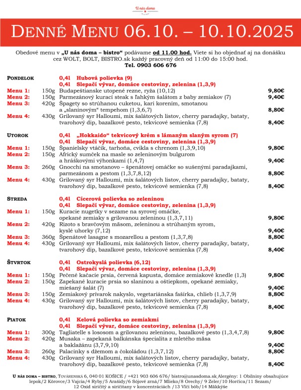 (7.10 2025) 1.Vegan menu: Sabji: Gobhi tamatar - karfiol s tofu v paradajkovej phansi omáčke (6, vegan) Príloha: pšeno Polievka: Fazuľová Salát: - kapustový s paradajkami a sézamom (11, vegan) Čatní 1: Jablkové čatny Čatní 2: Paradajkové čatny 300g /6.7€ 400g /7.7€ 600g /8.7€ 2.Govinda menu: Sabji: Matar alu tarkari - zemiaky, hrášok, paradajky, mandle v smotanovej omáčke s petržlenovou vňaťou (7,8) Príloha: pšeno Polievka: Fazuľová Salát: - kapustový s paradajkami a sézamom (11, vegan) Čatní 1: Jablkové čatny Čatní 2: Paradajkové čatny 300g /6.7€ 400g /7.7€ 600g /8.7€ 3.Ajurvédske menu: elixír zdravia pre telo 500g /8.7€ Aaloo brokoli - brokolica s arašidami, zemiakmi a petržlenovou vňaťou v hrachovom kréme s basmati ryžou, varené na GHÍ (8) Príloha: Čapáti - indická placka (1) Polievka: Fazuľová Chuťovky: Kofta z cvikle 1.2 € - cviklová fašírka so sézamom (1,11, vegan) Baklažánová pakora 1.2 € - baklažán obaľovaný v bezlepkovom cestíčku (vegan, bez lepku) Papadam 1.2 € - indický hrachový čips (vegan, bez lepku) Iné: Lasagne 350g 5,7 € - cestoviny, cuketa, špenát, paprika, smotana, syr, paradajky (1,7) Hare burger - syrový 5.4 € - celozrnná domáca žemľa, vegánsky bylinkový dresing (vegan majonéza), zeleninová fašírka , syr, paradajky, ľadový šalát, rukola, uhorky 350g (1,7,11) Vegan burger 5.4 € - celozrnná domáca žemľa, vegánsky bylinkový dresing (vegan majonéza), zeleninová fašírka , avokádo, paradajky, ľadový šalát, rukola, uhorky 350g (1, vegan) Govinda rolka 350g 5.4 € - šalát, kapusta, uhorka, paprika, cviklové fašírky, majonéza, rukola, paradajková omáčka, wrap placka (1,11) Nitai rolka z balkánskym syrom 350g 5.4 € - šalát, kapusta, uhorka, paprika, balkánsky syr, majonéza, rukola, paradajková omáčka, wrap placka (1,7) Nrsimha rolka – pikantná 350g 5.4 € - šalát, kapusta, uhorka, paprika, fazuľová plnka, tofu, čili, vegan majonéza, rukola, paradajková omáčka, wrap placka (1,6)