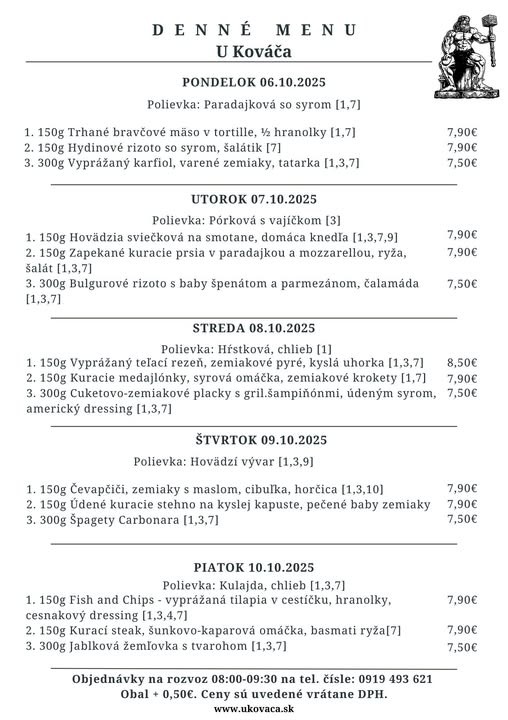 10. októbra Polievkadržková (1) » 3,00 €, vývar s cestovinou (1,3,9), fazuľová kyslá (1,7) Hlavné jedlo 1vyprážaný rybací karbonátok, zemiakový šalát (1,3,7) » 7,50 € 2bratislavský bravčový plátok, knedľa (1,3,7) » 7,50 € 3buchty s džemom a posekanými orechami (1,3,7) » 7,50 € 4divina guláš, knedľa ( 1,3,7) » 7,50 € 5vyprážaný syr, zemiaky, domáca tatarská omáčka (1,3,7) » 8,00 € 6vyprážaný bravčový / kurací rezeň, zemiaky, kapustový šalát (1,3,7) » 8,00 € Menu s polievkou 7,50 € s obalom 7,80 €. Menu polievka 1,80 € s obalom 2,00 €. K polievke chlieb, pečivo. Držková 3,00 € s obalom 3,20 €. Objednávky berieme od 10:00 - 14:00 t.č. 0904 233 533 , 0918 427 322 Minimálny dovoz jedla 7,80 €. Dovoz spoplatnený pre okolité obce. Nad 30 € dovoz zdarmo.
