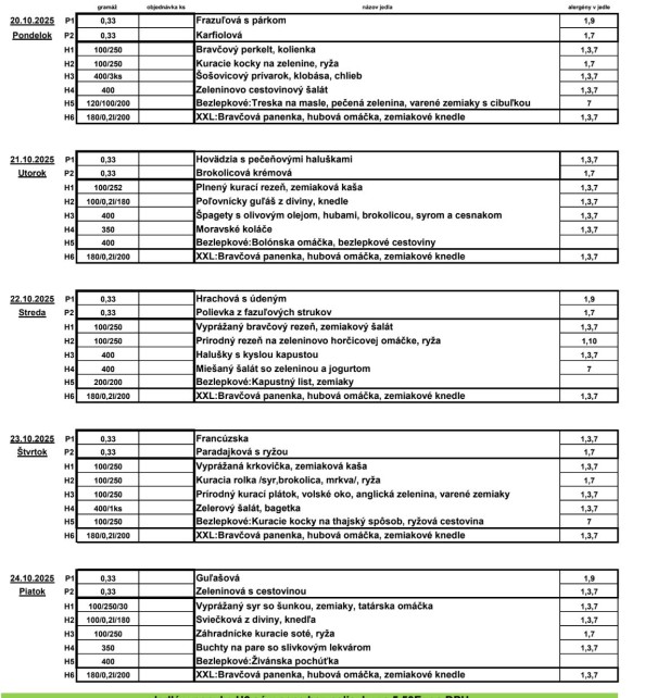 23.10.2025 0,33l Mäsový vývar s cestovinou a zeleninou (1,3) – 1,00€ 0,33l Hrstková so zeleninou – 1,00€ 150g Kurací rezeň so zemiakovým šalátom (1,3,7) – 6,40€ 350g Viedenská krkovička so štuchanými zemiakmi, čalamáda (7) – 6,40€ 350g Zeleninový kuskus s grilovaným hermelínom, dresing (1,7) – 6,40€ 350g Pečené morčacie mäso na šalviovej omáčke s zemiakovo – paštrnákovým pyré (7) – 9,50€ 350g Udon Pad Thai so zeleninou, kuracím mäsom, sezamom a šampiňónmi (1,4,6,11,14,16) – 7,10€