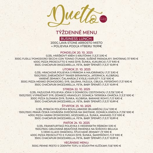 Menu polievka -Špenátová s krutónmi (1,7) /1,7 / Polievka je v cene menu / samostatná len polievka 2,50 Menu 1- Kuracia roláda (slanina, syr), omáčka z pečeného cesnaku, ryža 1,3,7 Menu 2 - Reznovačka“ (bravčový a kurací rezeň), majonézový šalát 1,3,7,10 Menu 3 -Pizza Quattro Formaggi 1,4,7 Menu 4 - Vyprážaný karfiol, varené zemiaky, tatárska omáčka