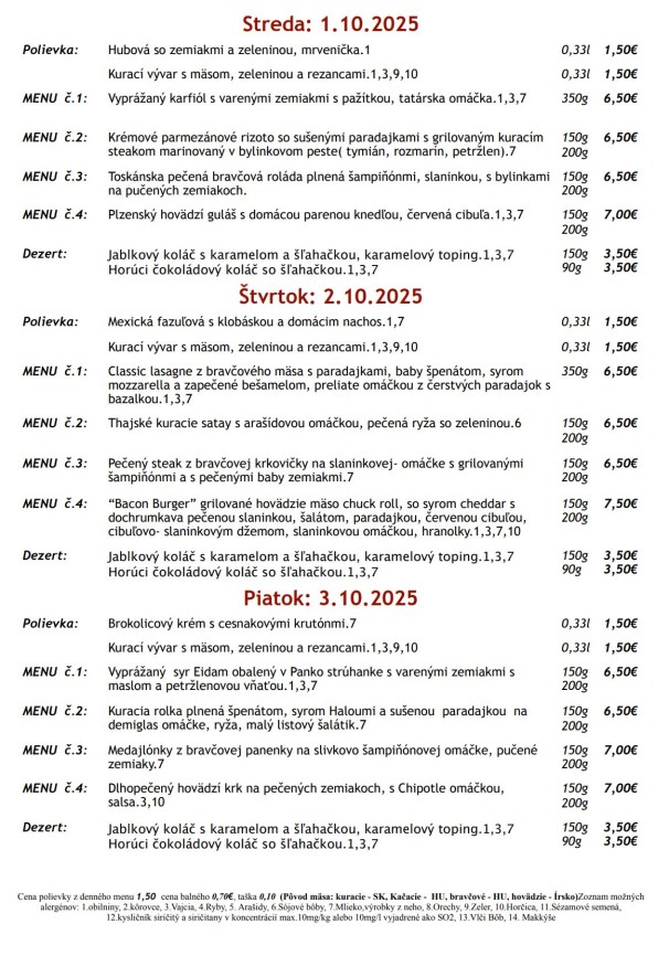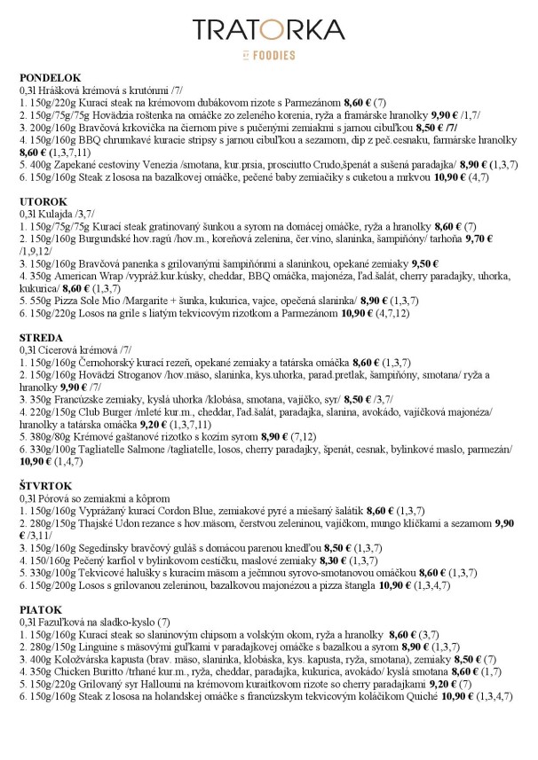 0,3l polievka: Kelová so slaninkou 1/ Slepačí vývar s rezancami 1,3,9 601 350g Chicken burger /vyprážané rezníky z kuracích stehien, ľadový šalát, slaninový chips, čedar, kyslá uhorka ,paradajka, červená cibuľka, chipotle dip, majonéza/, fritované hranolky 1,3,7,11 7,70€ 602 150g Pečená údená krkovička na čiernom pive a cesnaku s dusenou kyslou kapustou a pečenými zemiakmi s cibuľkou a slaninou 7,40€ 603 150g Kuracie rezančeky s čínskou zeleninou, hubami, pórkom a sezamom, jazmínová ryža 6,8,11 7,40€ 604 300g Bryndzové halušky s opečenou oravskou slaninkou, posypané údeným syrom 1,3,7 7,40€