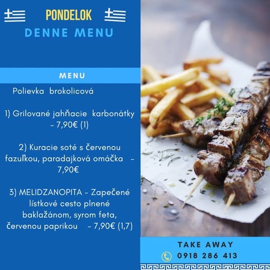 Denné menu: Polievka 1: Hrášková s krupicovými haluškami (1,3,7) 0,33l Polievka 2: Slepačia polievka (1,3,9) 0,33l Menu 1: Kurací steak zapečený s broskyňou a syrom, dusená ryža (1,7) 120g/180g 7.45 € Menu 2: Segedínsky guláš, parená knedľa (1,7) 120g/150g 7.45 € Menu 3: Vyprážaný oštiepok so šunkou, opekané zemiaky, tatárka (1,3,7) 120g/200g 7.45 € Menu týždňa: Nápoj: Post mix podľa výberu Polievka: Hlavné jedlo: Fazuľová Jokay s br.mäsom,klobásou,údeninou,rezancami a chlebíkom (1) 0,5l 5.00 €