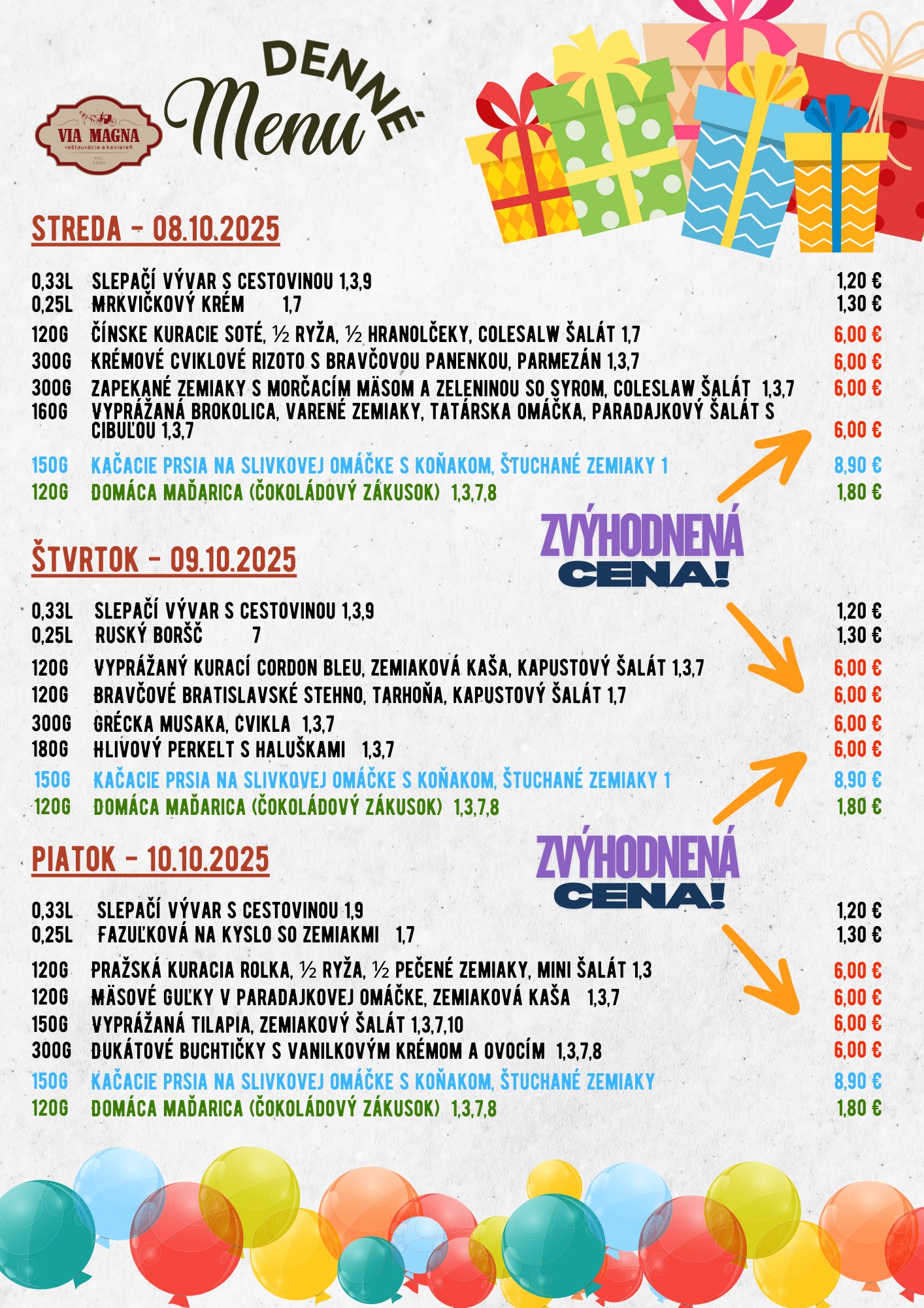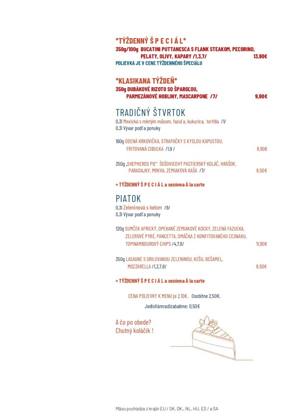 0,33l Cviklový krém s krutónmi (1,7) 1,80 1. 120g/180g Kuracia roláda so žemľovou plnkou a brusnicami, ryža, kompót (1,3,7) 6,50 2. 120g/180g Srbské bravčové soté, slovenská ryža (1) 6,50 3. 120g/90g/90g Rybie filé na masle, varené zemiaky, obloha (4,7) 6,50 4. 300g Šišky s džemom (1,3,7) 6,50