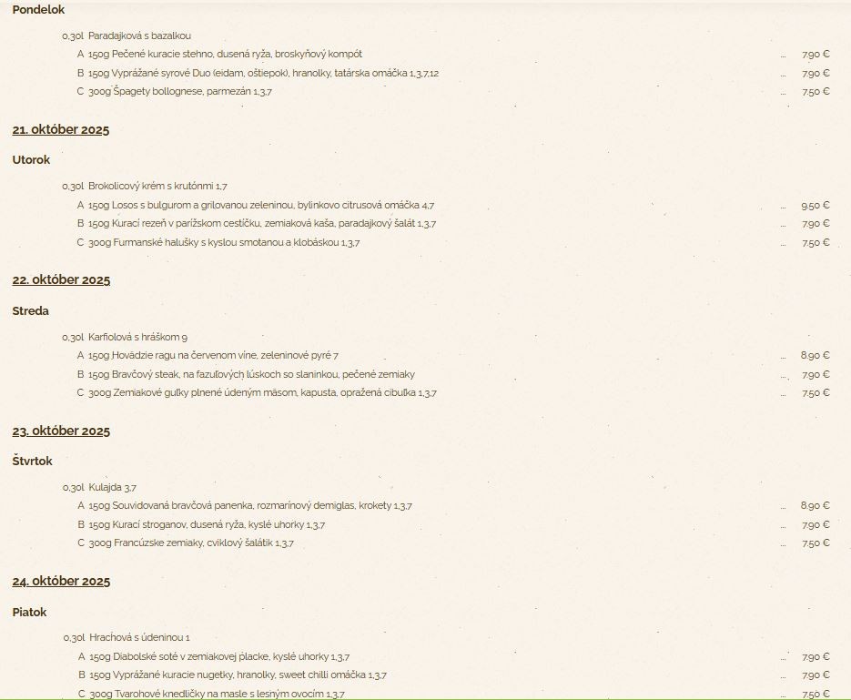 Hrachová polievka (1) A) Kurací rezeň v parmezánovom cestíčku so zemiakovou kašou a cviklou (1,3,7) B) Bravčové karé na spôsob roštenky s dusenou ryžou (1) C) Bryndzové halušky s opečenou slaninkou (1,3,7) D) Domáce parené buchty (mak, granko, tvaroh) (1,3,6) 7,20€