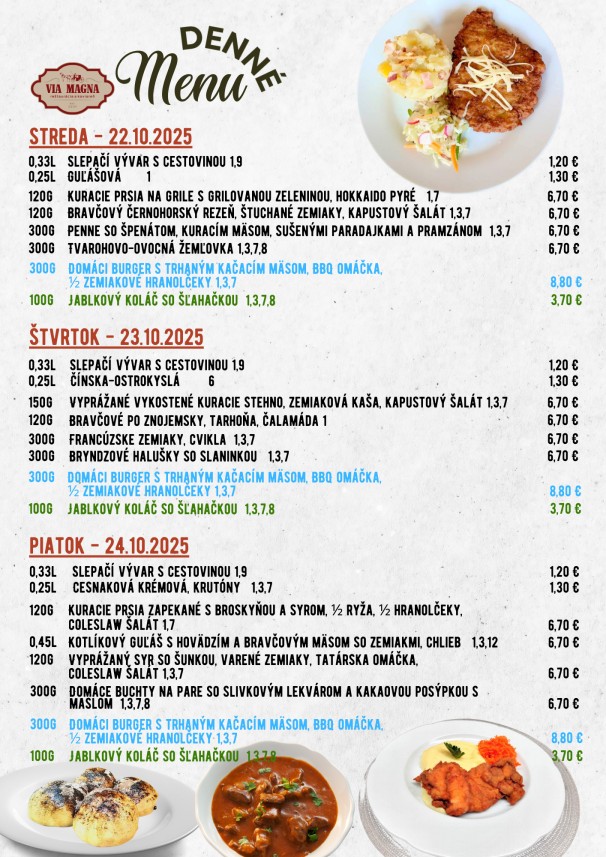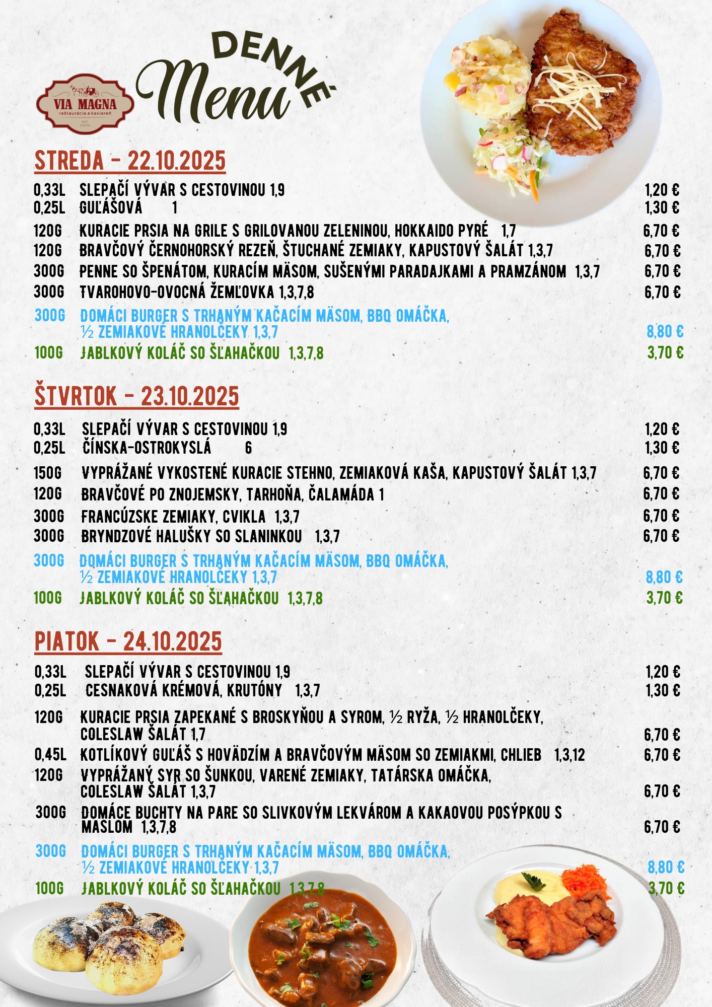 23.10.2025 POLIEVKA / 240 €: Kyslá zemiaková s hubami a kôprom (0,4 l) HLAVNÉ JEDLO / 750 €: ➊Kuracie soté s hráškom, červenou cibuľou a kolienkami (350 g) ➋Ratatouille rizoto s parmezánom (350 g) HLAVNÉ JEDLO / 980 €: ➌Kúsky hovädzej sviečkovice na póre, gratinované zemiaky (350 g) DEZERT / 280 €: Čokoládová rubi kocka (80 g)