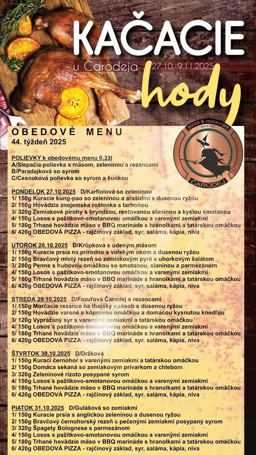 - 28.10. POLIEVKA 1 - 0,33l 0,33l FAZUĽOVÁ S KLOBÁSKOU A REZANCAMI, CHLIEB A:1 POLIEVKA 2- 0,33l 0,33l SLEPAČÍ VÝVAR S REZANCAMI A ZELENINOU A:1,3,9 POLIEVKA 3- 0,33l 0,33l DOMÁCA KAPUSTNICA, CHLIEB A:1 M1 150g BRAVČOVÁ PEČENÁ KRKOVIČKA, DUSENÁ HLÁVKOVÁ KAPUSTA, KNEDĽA A:1,3 M2 150g KURACIE NA TERIJAKY SPôSOB S ČÍNSKOU ZELENINOU, JASMÍNOVÁ RYŽA, A: M3 280g GRANATIERSKY POCHOD, KYSLÁ UHORKA A:1, M4 280g POKÉ BOWL S REĎKOVKOU, CHERRY PARADAJKAMI, UHORKAMI , MRKVOU, CÍCEROM A TERIJAKY LOSOSOM A: 4 GURMÁN 200g TEKVICOVÉ KRÉMOVÉ RIZOTO S HOVäDZÍMI REZANCAMI, PARMEZÁN , RUKOLA A:7